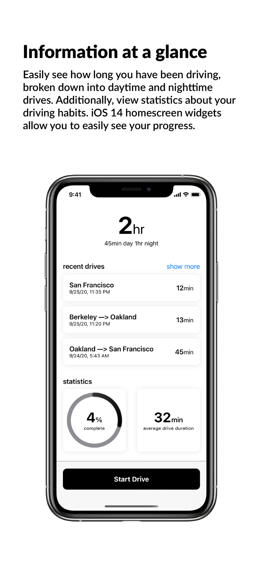 Easily see how long you have been driving, broken down into daytime and nighttime drives. Additionally, view statistics about your driving habits. iOS 14 homescreen widgets allow you to easily see your progress.