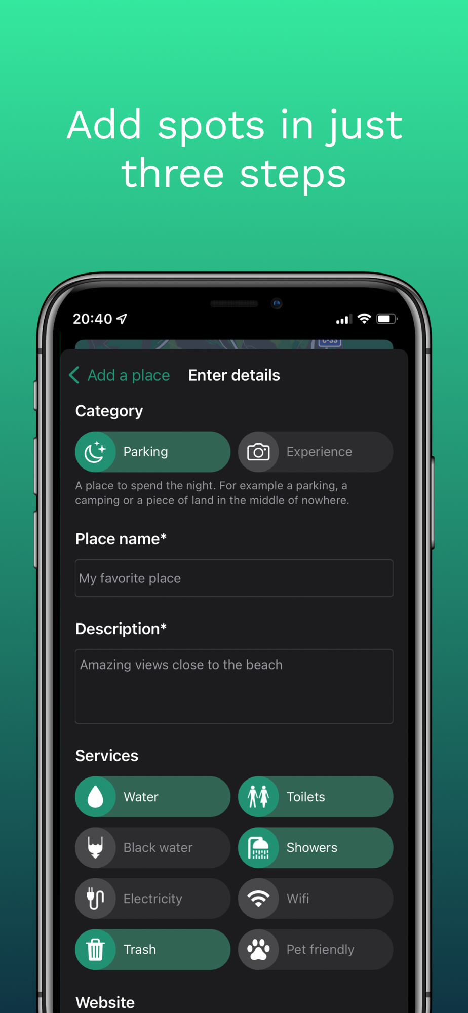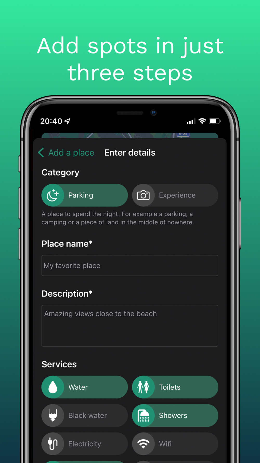 Campernight has a super intuitive interface and it's really simple to use. Search using the map or the search bar and check the pictures and description of a place. If you like it, you can easily navigate to it or share it with your friends. You can also see who posted the place and directly open his/her Instagram profile (if they provide it). There is also information about the services available like water, electricity, showers or wifi.