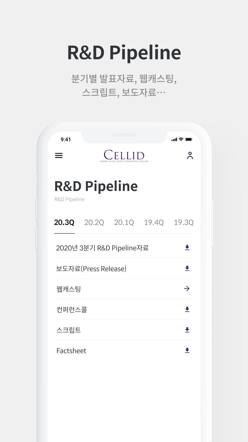 셀리드 “IR Page” Application은 실시간 주가, IR일정, 분기별 실적발표자료, 다양한 IR News, 주요 경영보고서, 재무정보, 공시, IR담당자 Contact 정보 등 최신 IR정보를 제공합니다.