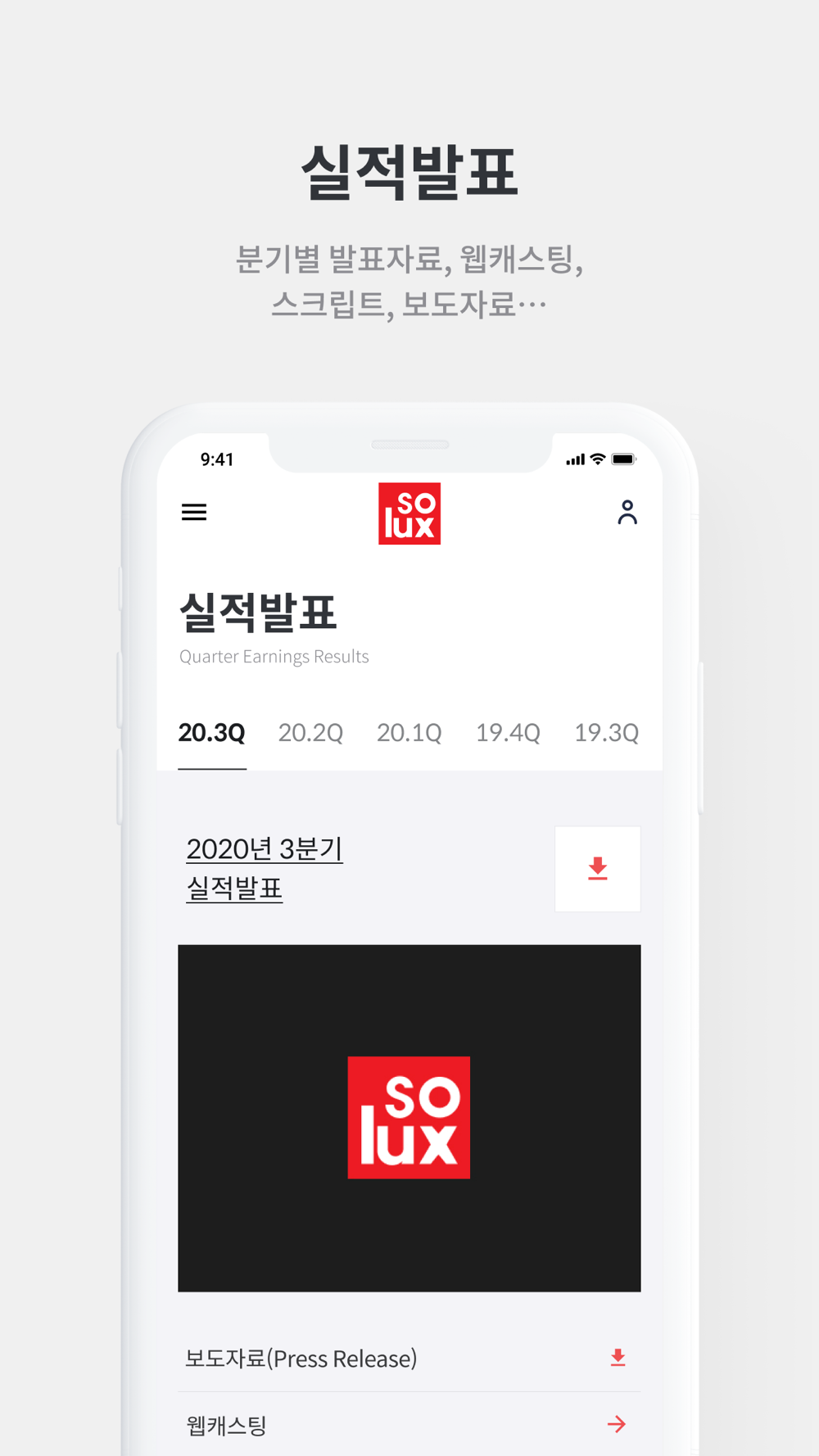 소룩스 “IR Page” Application은 실시간 주가, IR일정, 분기별 실적발표자료, 다양한 IR News, 주요 경영보고서, 재무정보, 공시, IR담당자 Contact 정보 등 최신 IR정보를 제공합니다.