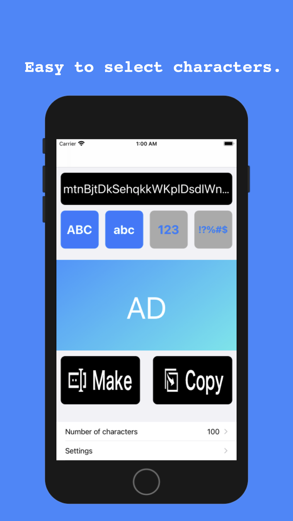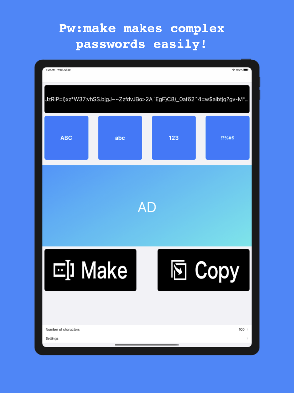 Pw:make is easy to operate. Just tap the Make-button and your password will be created.