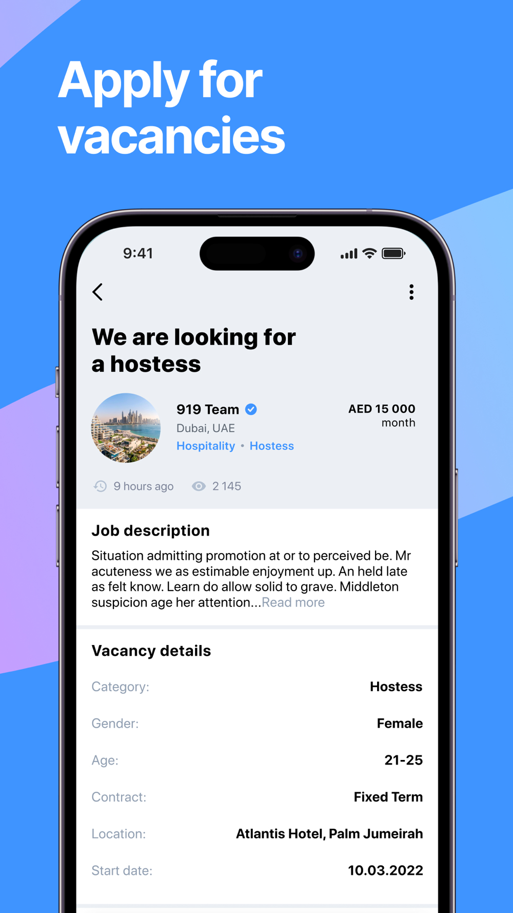 With application 919 you will always be aware of current high-paying vacancies or get access to a wide database of job seekers in your region and the World.