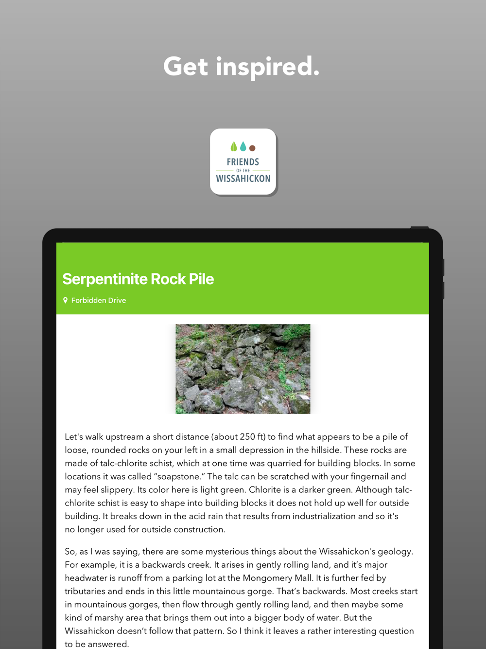 Let's be friends! Founded in 1924, Friends of the Wissahickon is a 2,500-member nonprofit organization that works in partnership with Philadelphia Parks & Recreation to restore historical park structures, eliminate invasive plant species, monitor watershed management issues, and restore trails throughout Wissahickon Valley Park. Check us out at fow.org. This app will make use of your GPS which can cause a decrease in battery life.