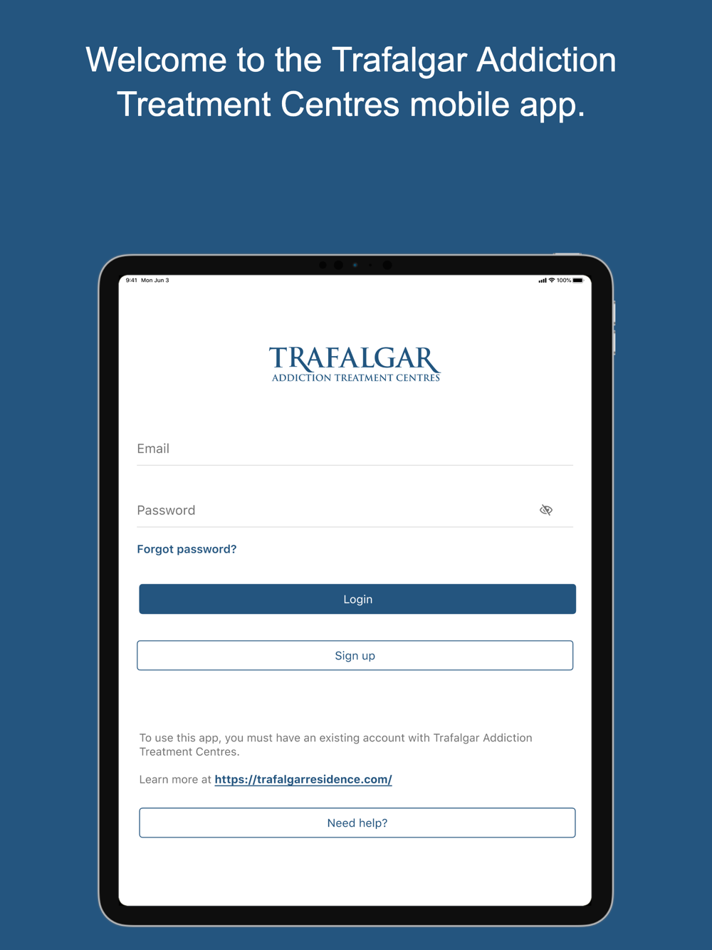 To use the Trafalgar Addictions Treatment Centres mobile application, you must have an