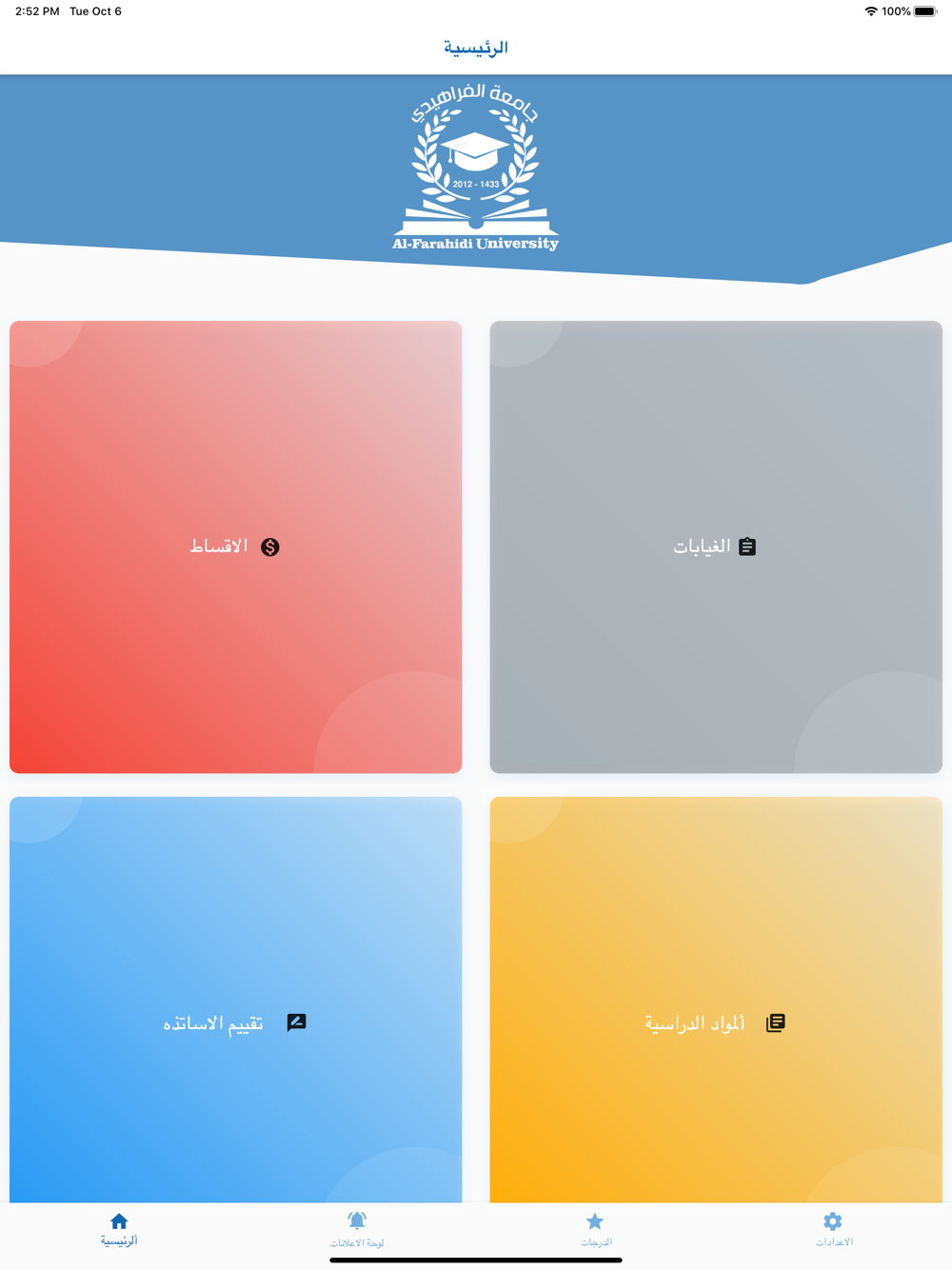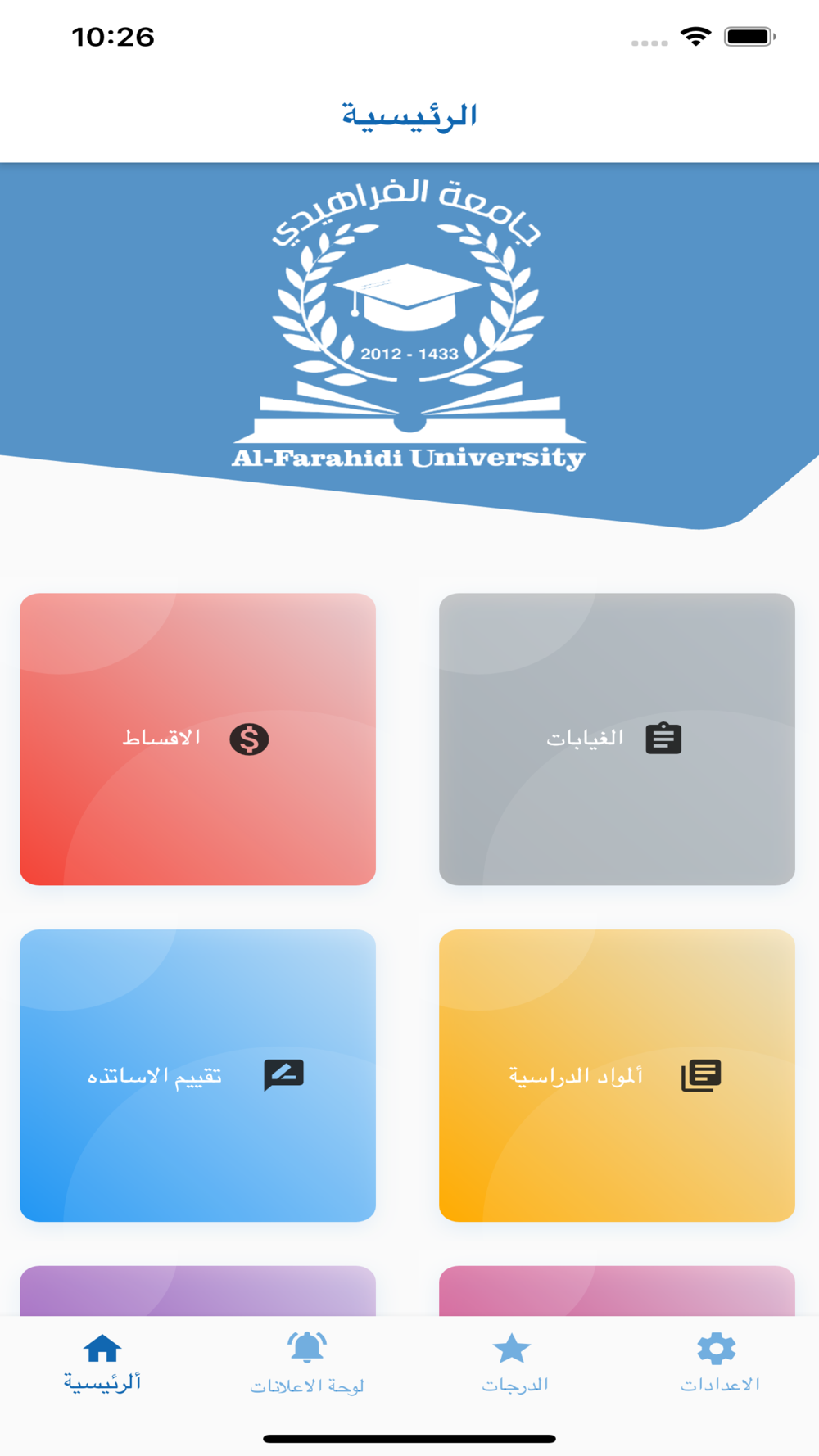 Student application for Al-Farahidi University, where the student can enter the application to view grades, download study lectures, follow university announcements, view absences and installments.