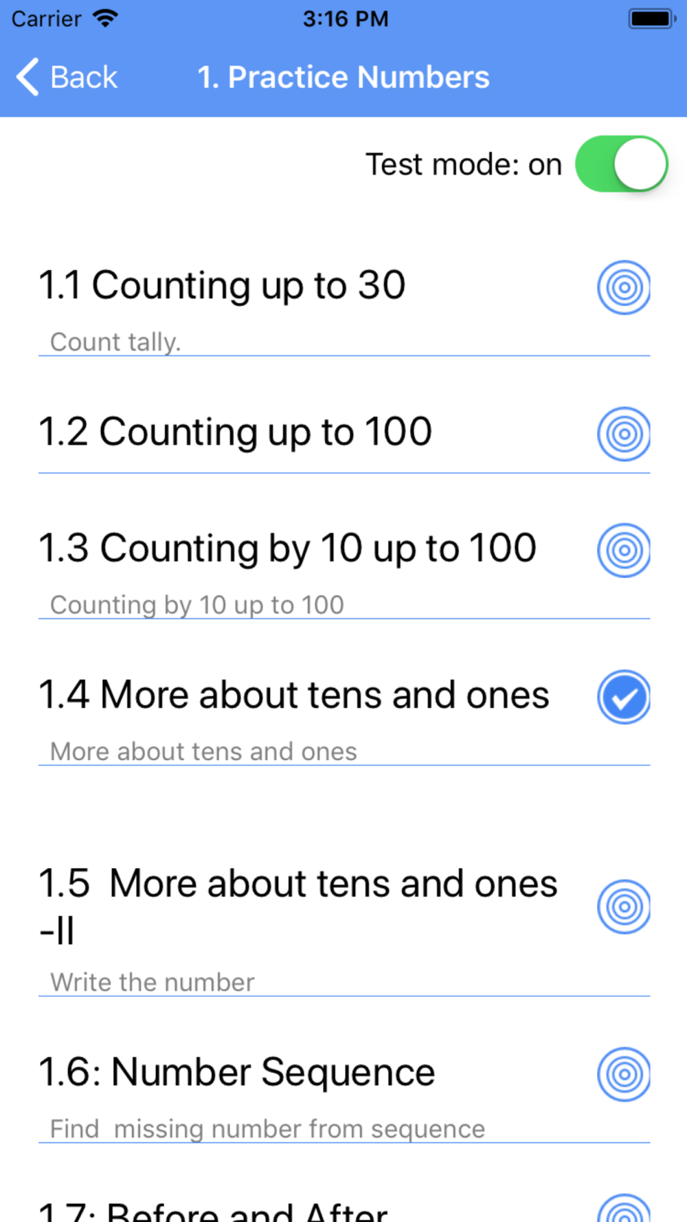 * App Mode: Practice/Test. In practice mode, the student will get the same questions every time unless they change the setting. In test mode, the questions are randomized.