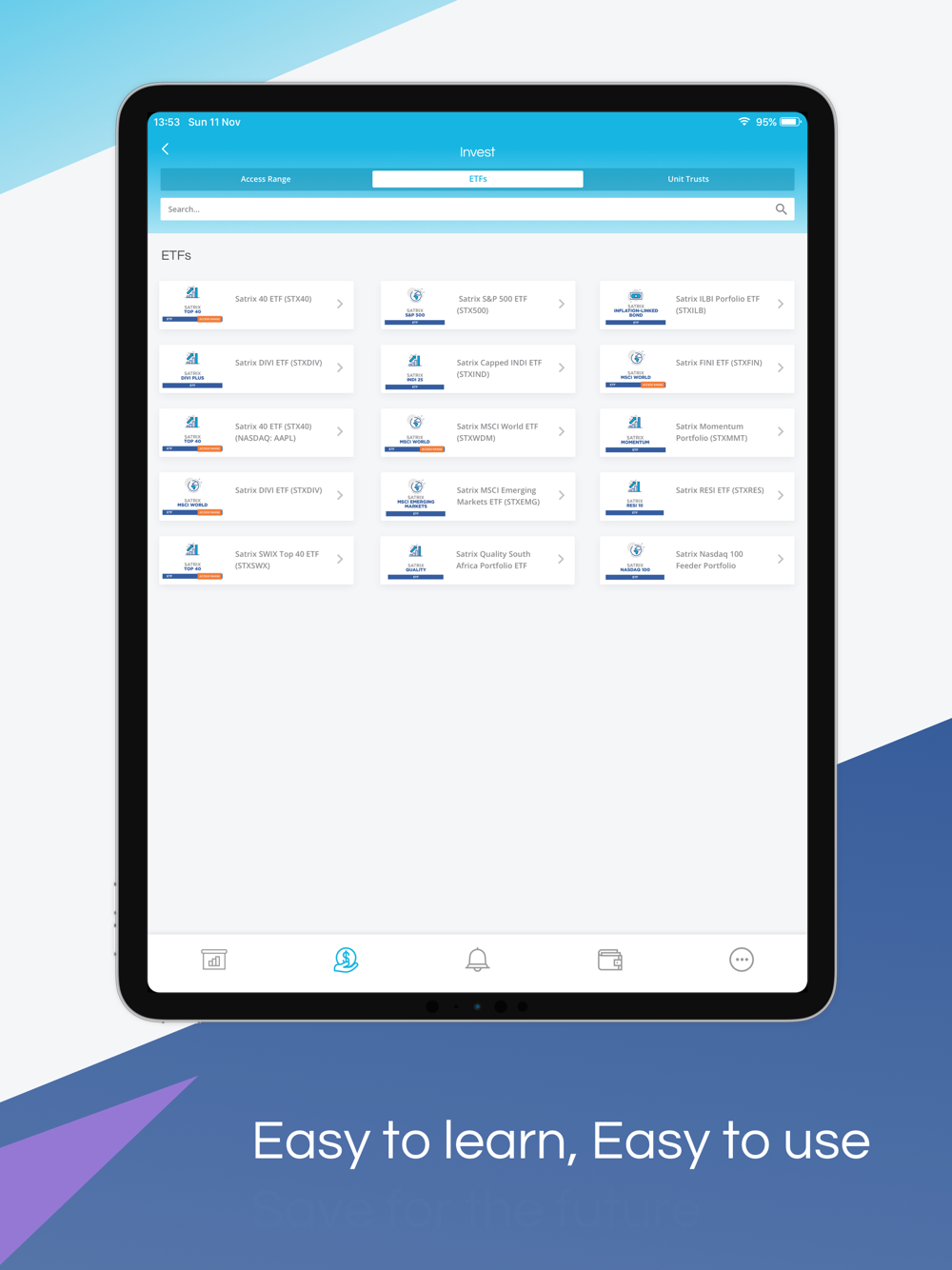 - Explore all the Satrix ETFs and Unit Trust in a single interface, across multiple account types