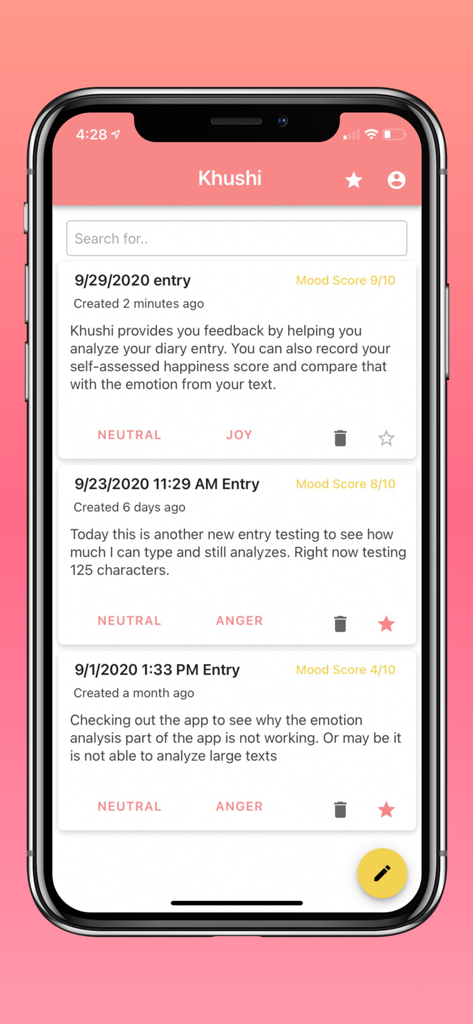 Write your entries as you normally would, and Khushi will analyze the text for you and provide emotion and sentiment analysis. Record your mood with a simple scale and see how it correlates.