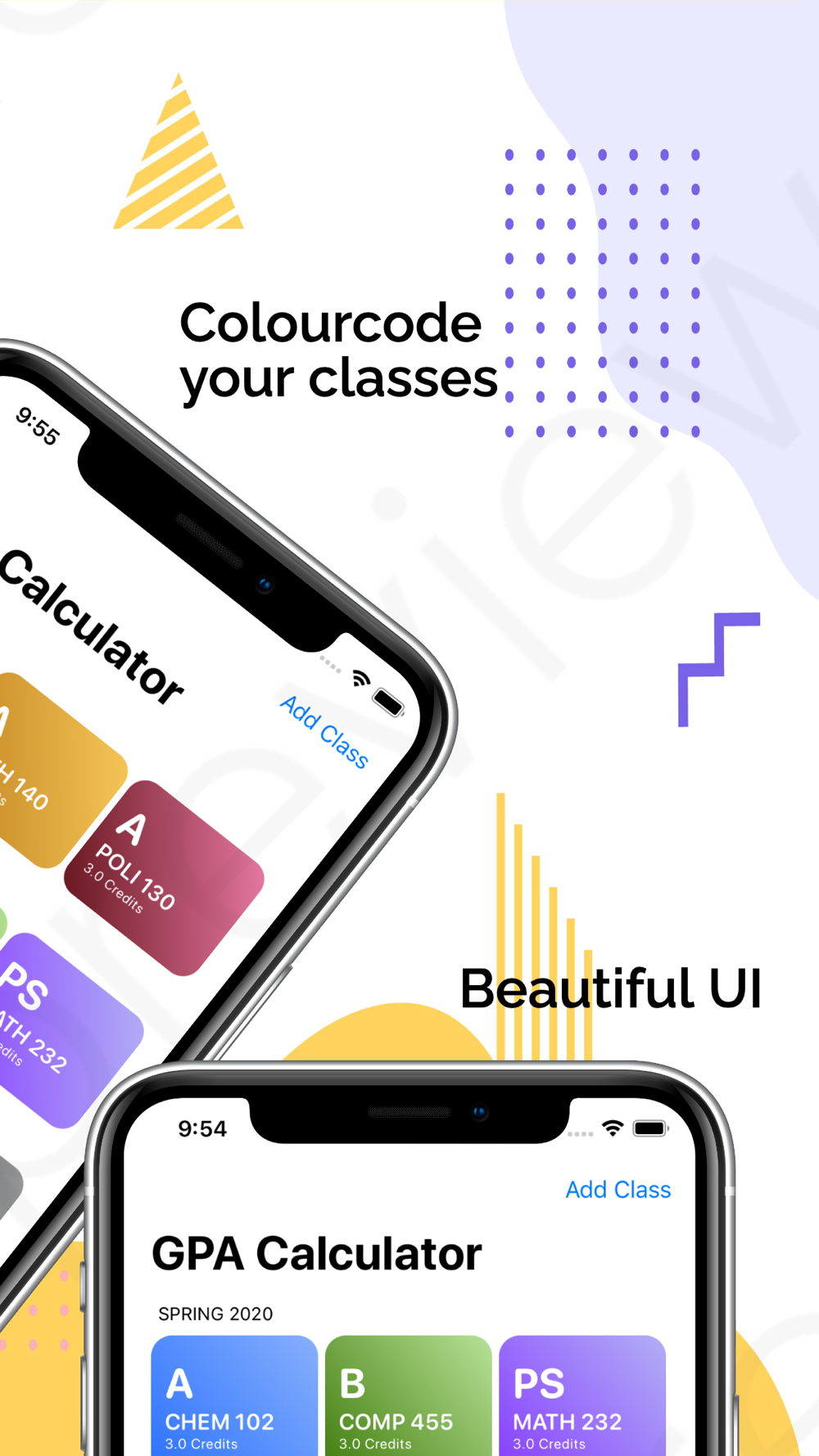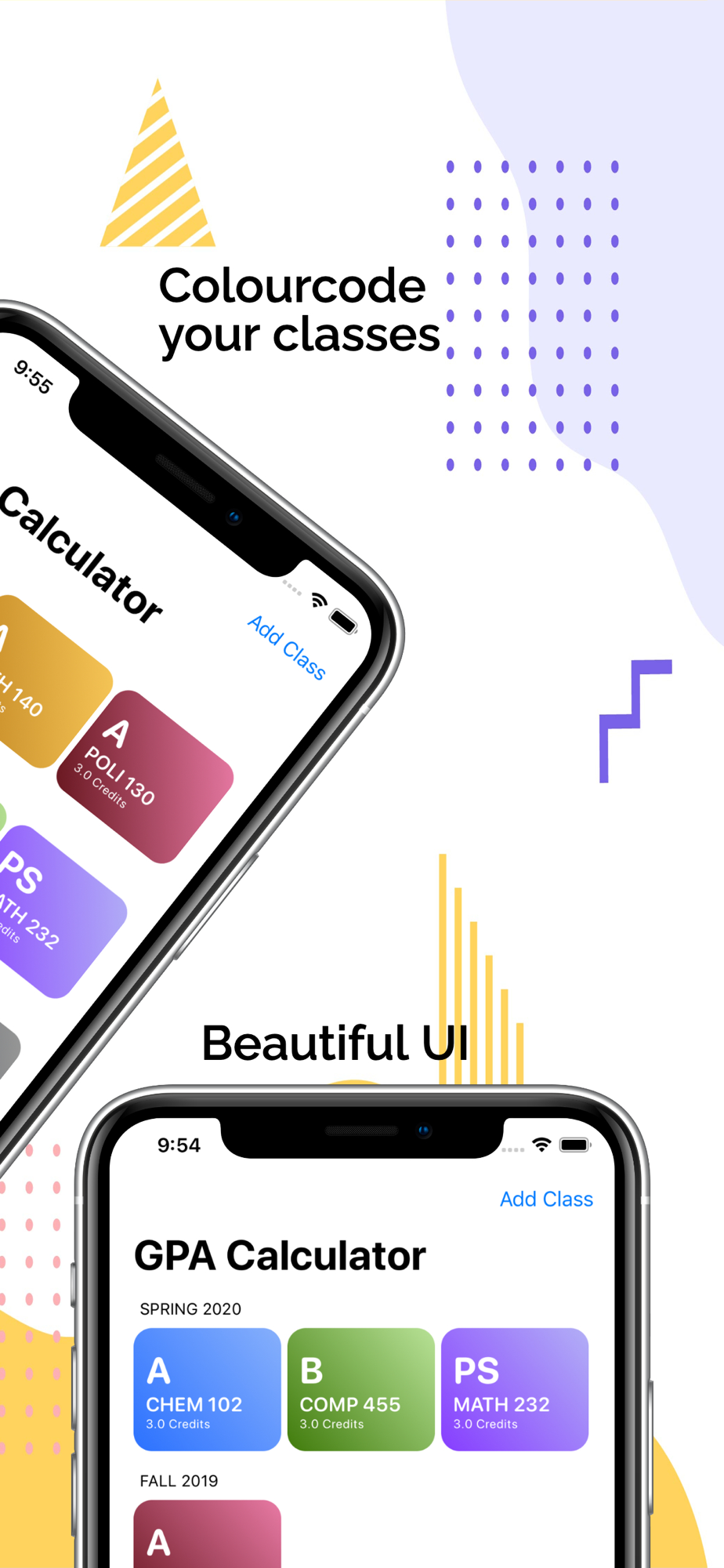 Are you tired of typing out all your classes every time you finish an exam? Our beautiful UI helps you track and organize your classes and the grades you receive in them so that you can calculate your GPA instantly!