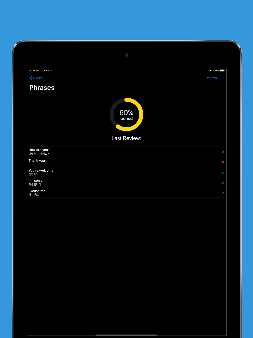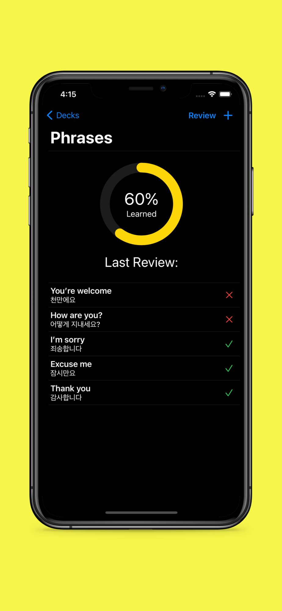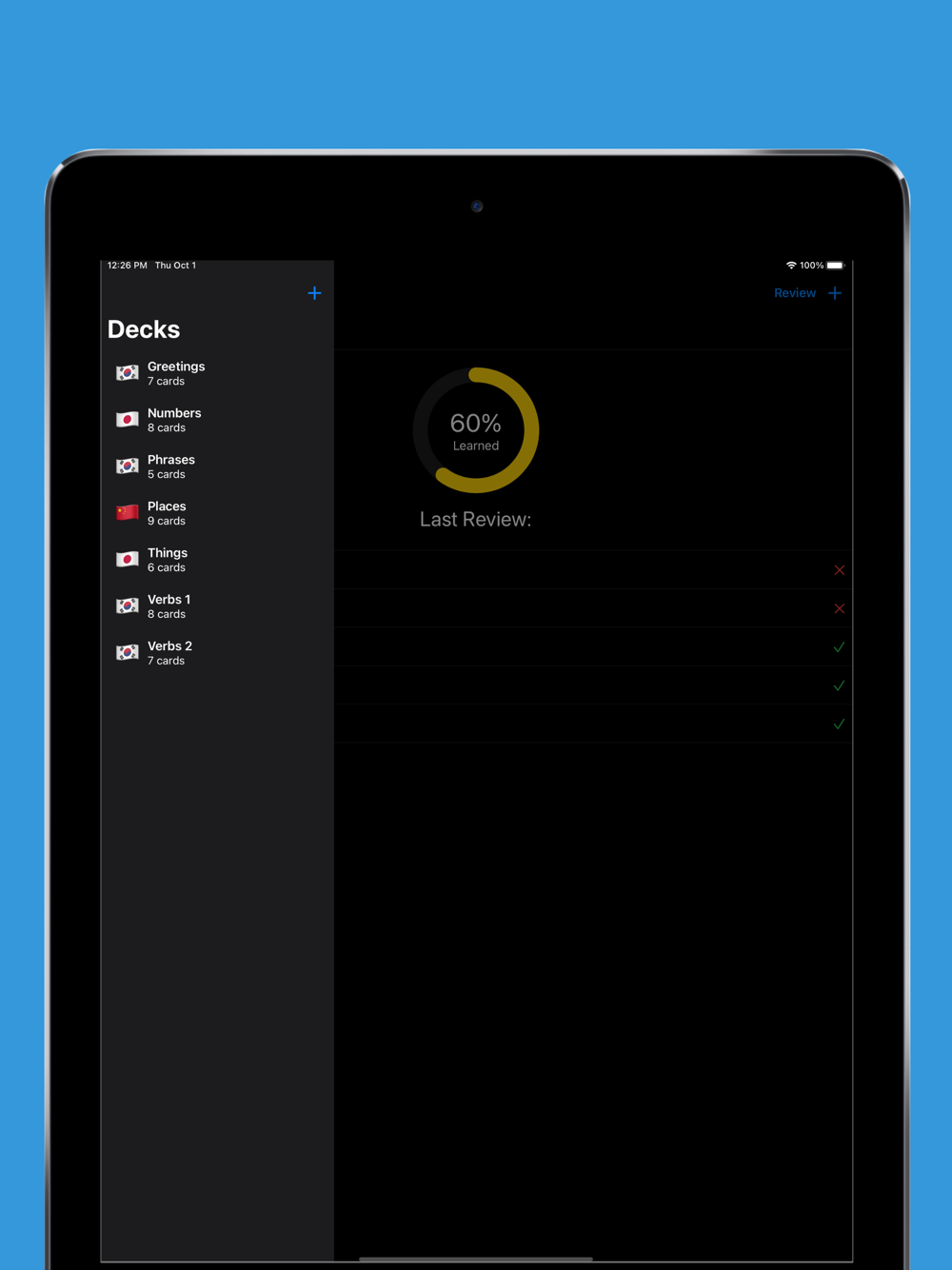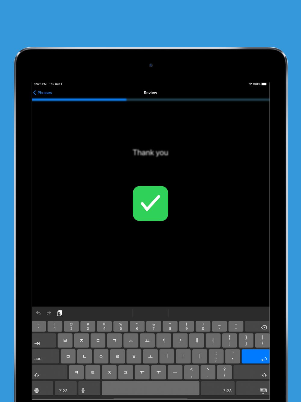 Unlike other flashcard apps, Kata makes you type your answers with that language's keyboard. Kata helps you learn flashcards, and at the same time familiarise yourself with how to write in that language on a device.