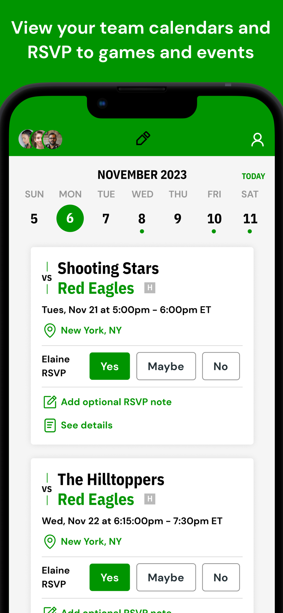 - RSVP for games, tournaments, practices, and more, and view locations and directions