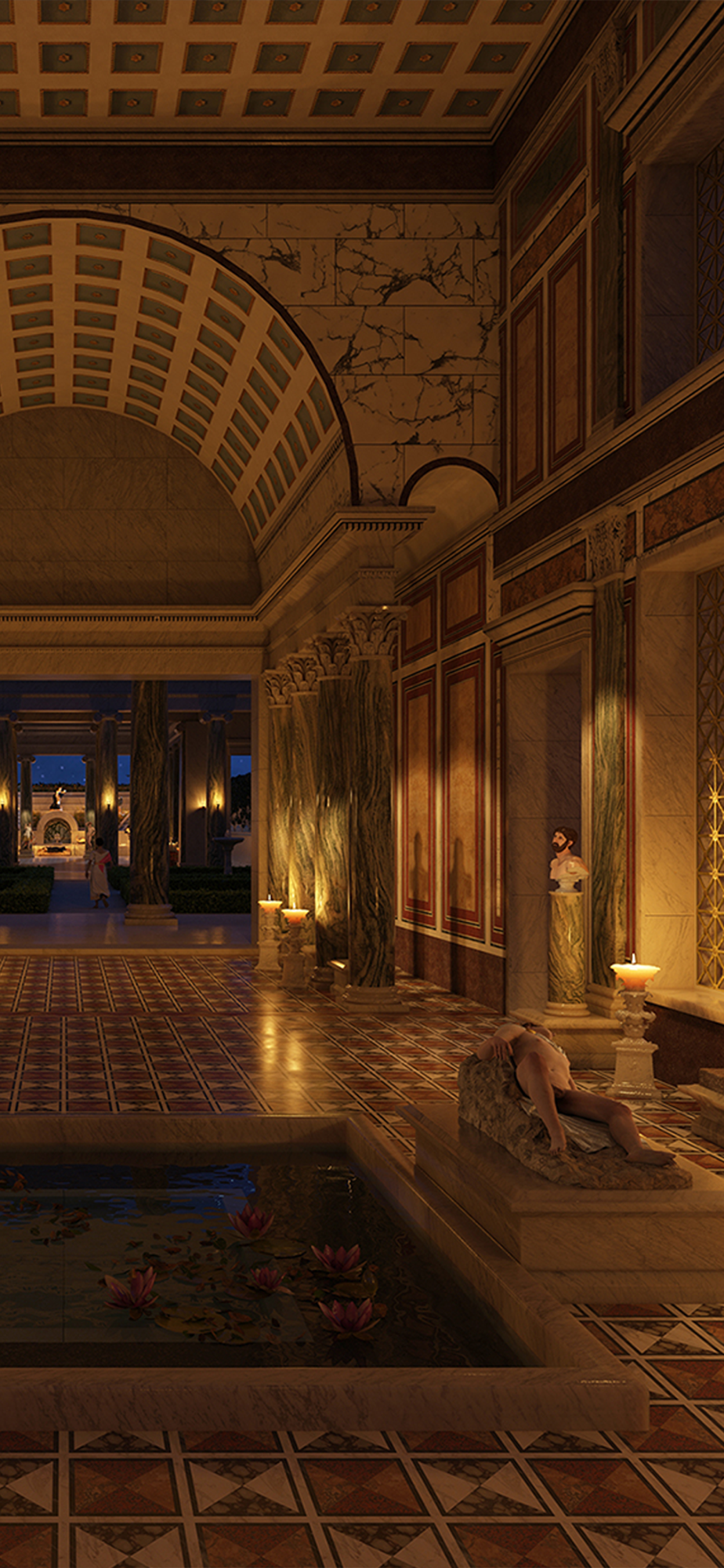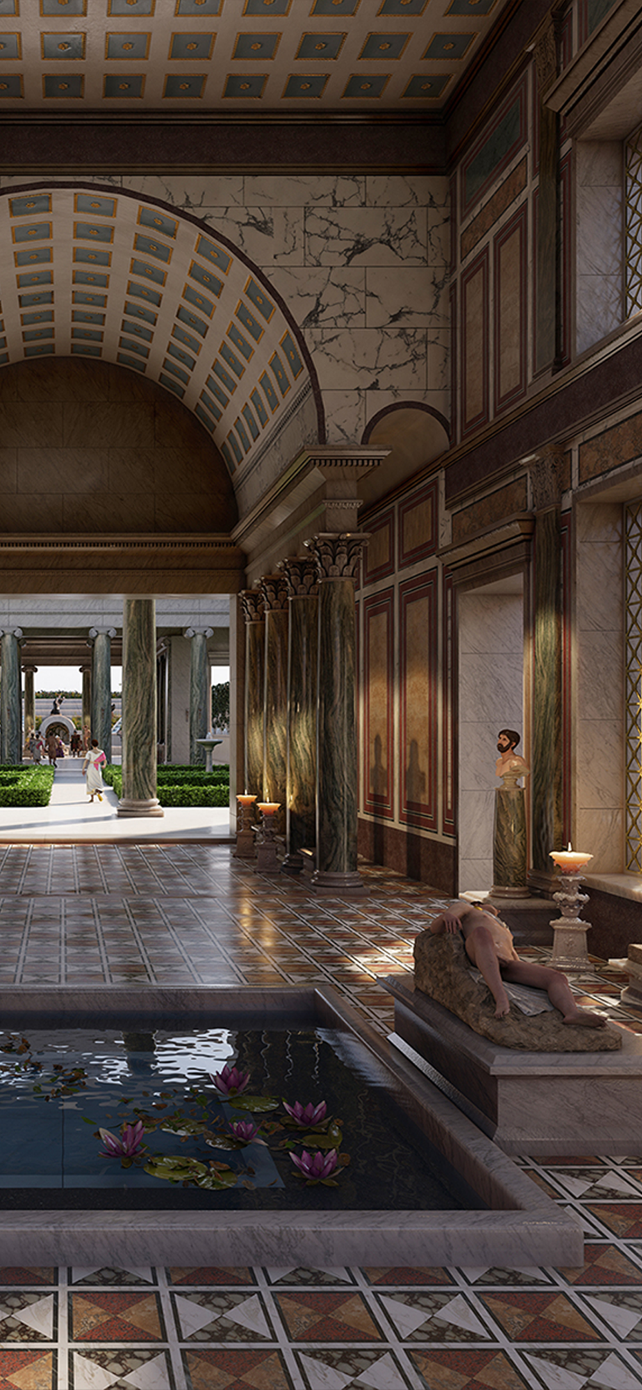 This virtual tour presents the Stadium Garden. “Stadium Garden” is the modern name for a major complex at Hadrian’s Villa that, despite what we conventionally call it, was neither a stadium nor a garden. Instead, it consisted of structures used in warm weather to host imperial audiences, receptions, dinner parties, and ambulationes. The virtual tour takes you back in time to the 130s CE so that you can visit the site reconstructed as it appeared late in the reign of Hadrian. Along the way, you can also go up into the air to see the villa in the context of the enchanting landscape of the Tivoli area.