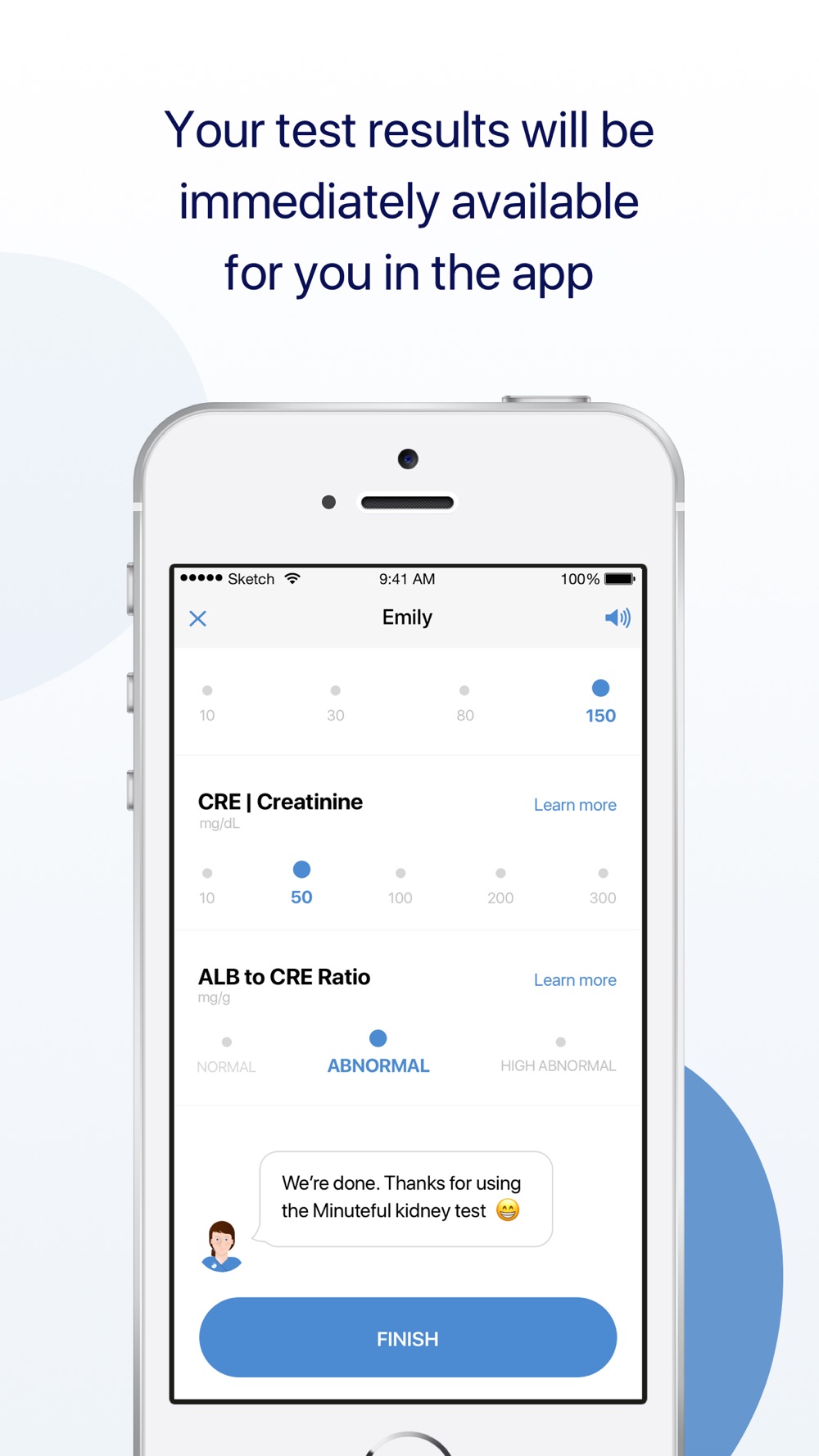 The Minuteful - kidney test app will guide you through a short urine test to assess the Albumin-to-Creatinine ratio in your urine. Once the test is complete, results will be securely transmitted to a healthcare professional to determine further care. The Minuteful - kidney test device can provide an early indication of kidney damage.