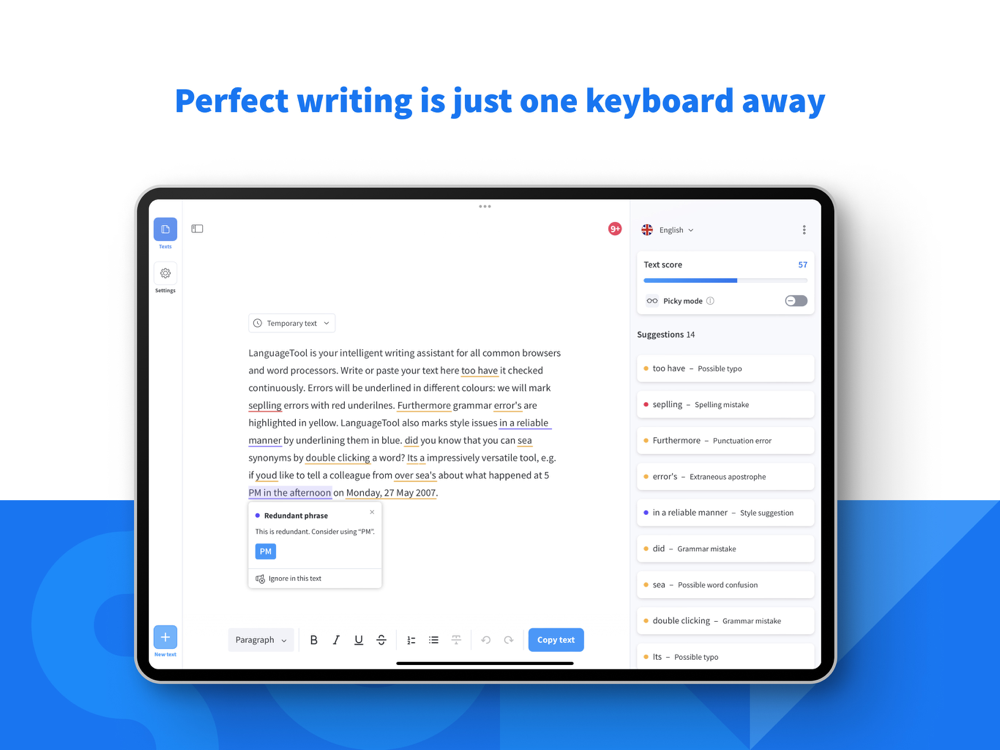 The importance of written communication is increasing, especially in times where working from home is more in demand. Ensure that your writing is proficient and professional at all times by using LanguageTool to prevent embarrassing spelling mistakes and avoid colloquial phrases.