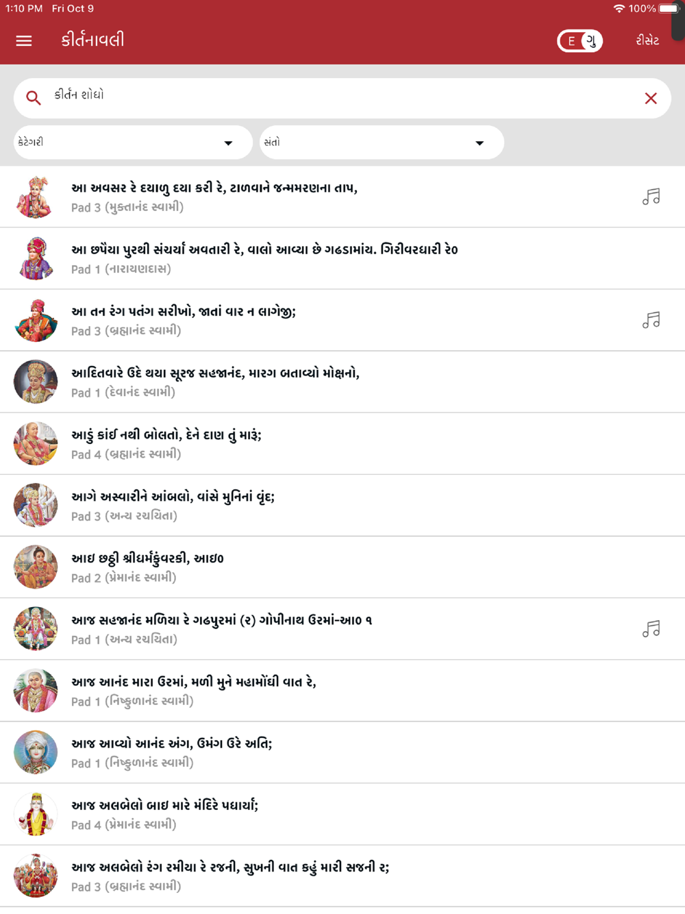 - All Kirtans are available in Gujarati and English Lipi.