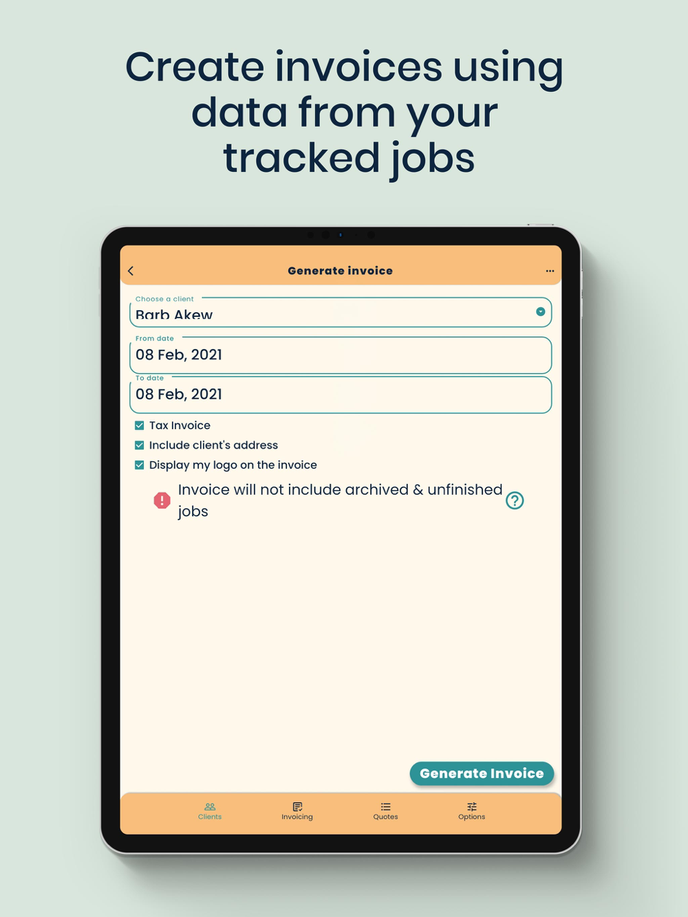 Invoices are generated automatically from your tracked jobs: choose client, specify date range and go!
