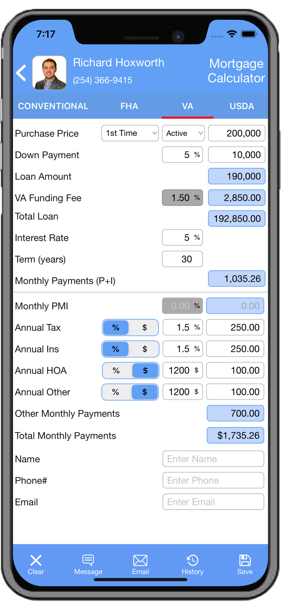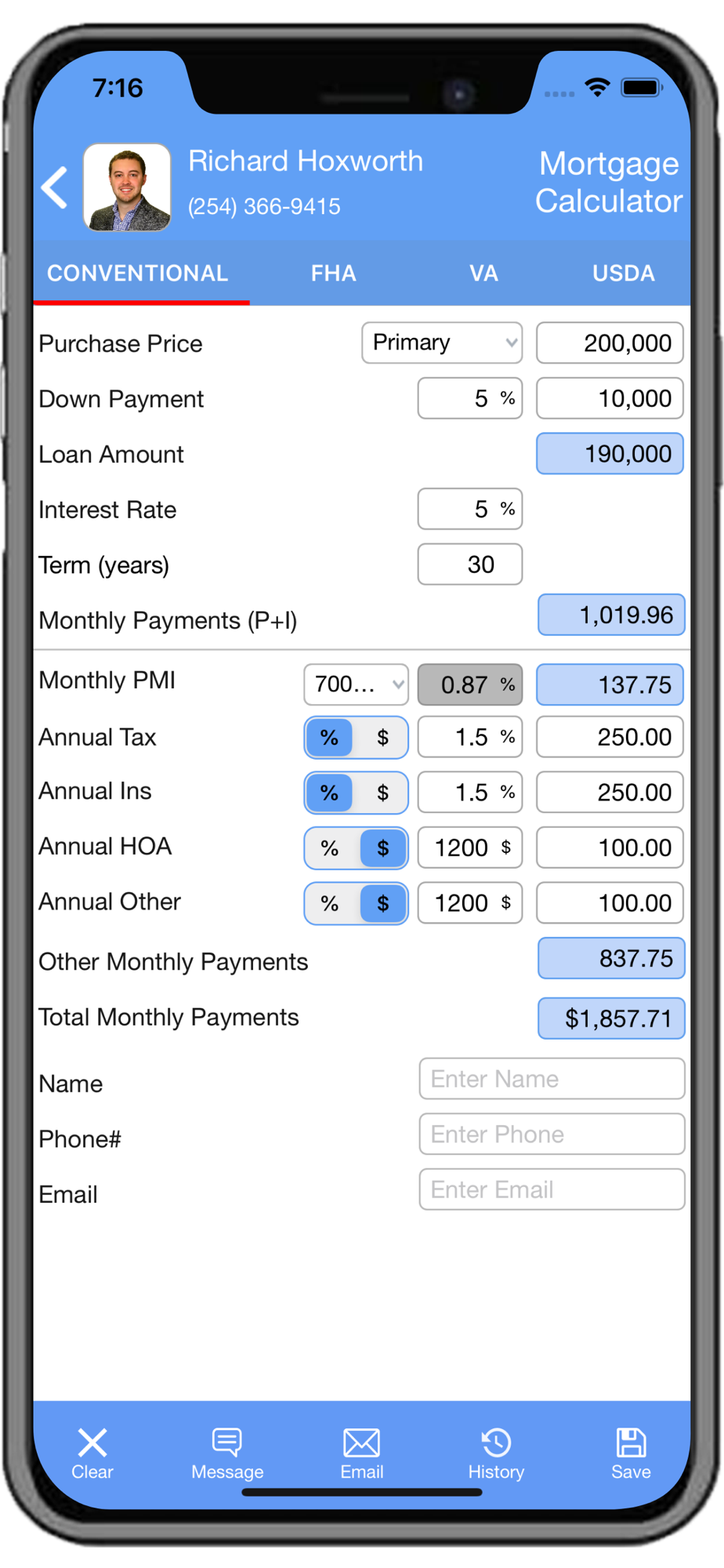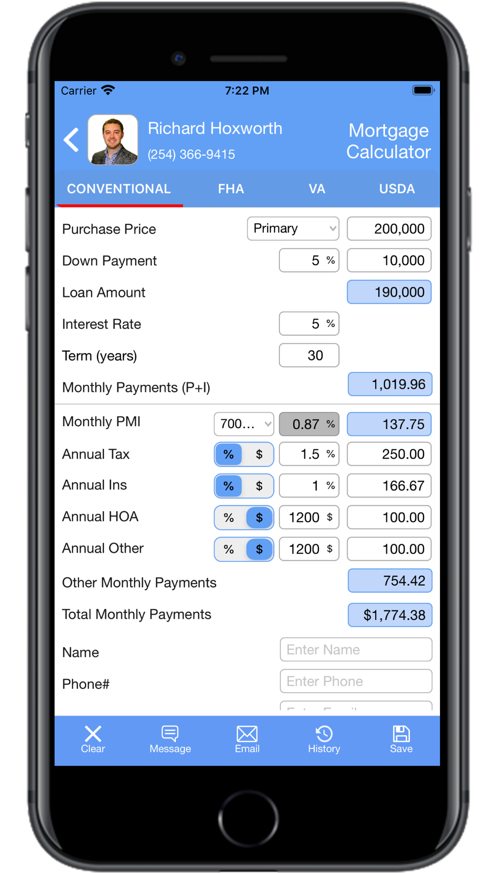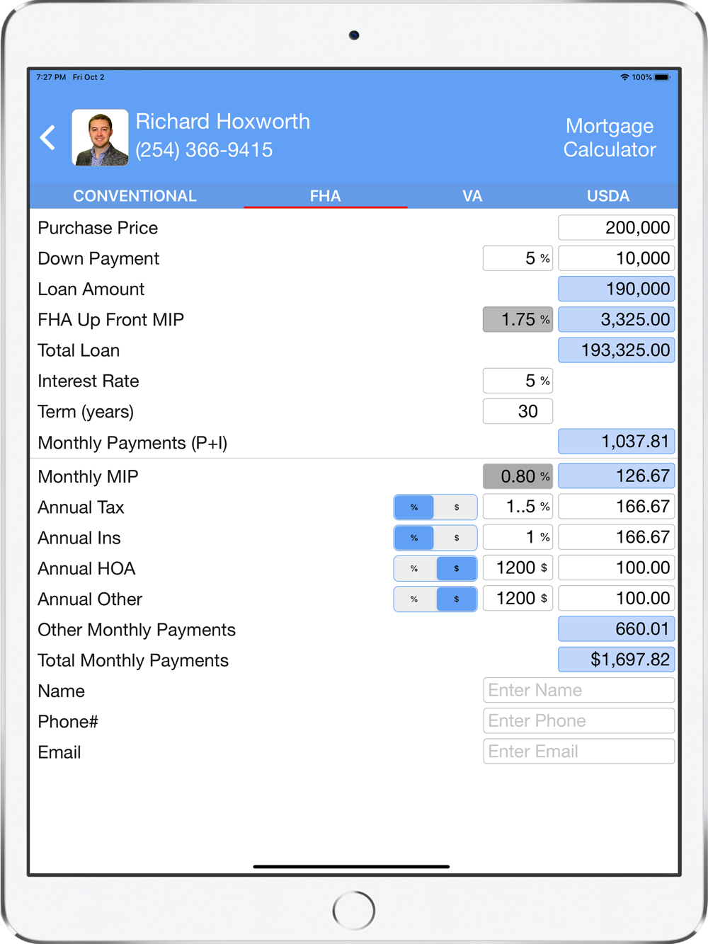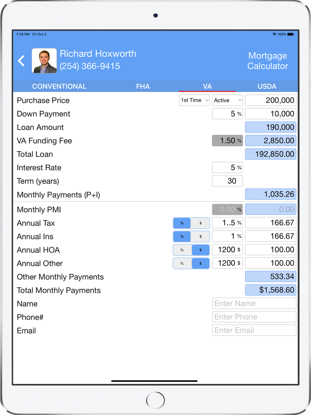 • Quick: Calculates Conventional, FHA, VA & USDA, without switching screens