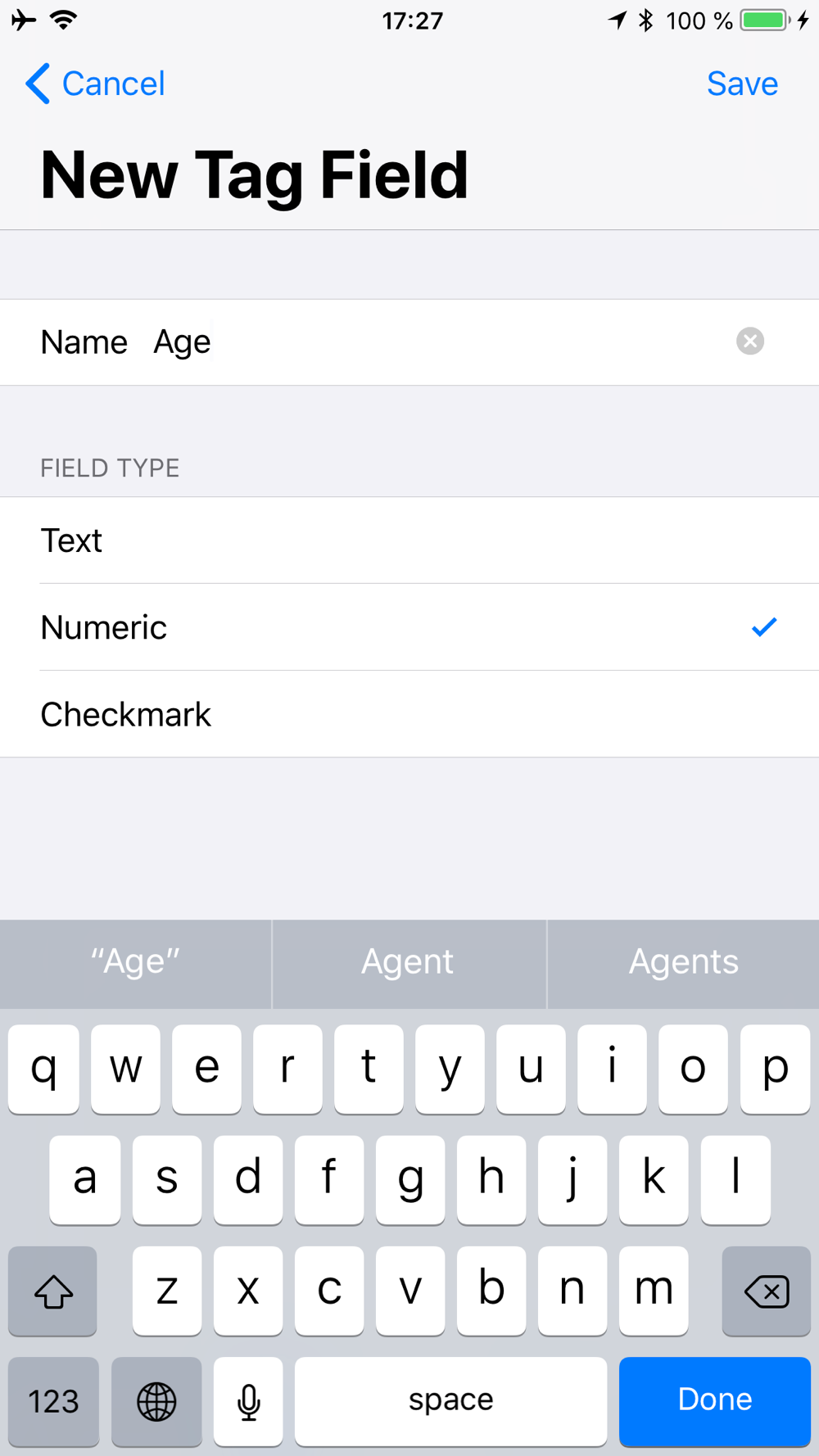 • Supported custom field formats: text (alphanumeric), number (numeric), switch (boolean)
