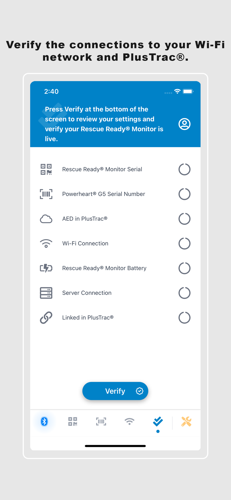 ZOLL RRM allows you to connect, configure, and verify your Rescue Ready® Monitors' settings and connection to a Powerheart® G5 managed by PlusTrac®.