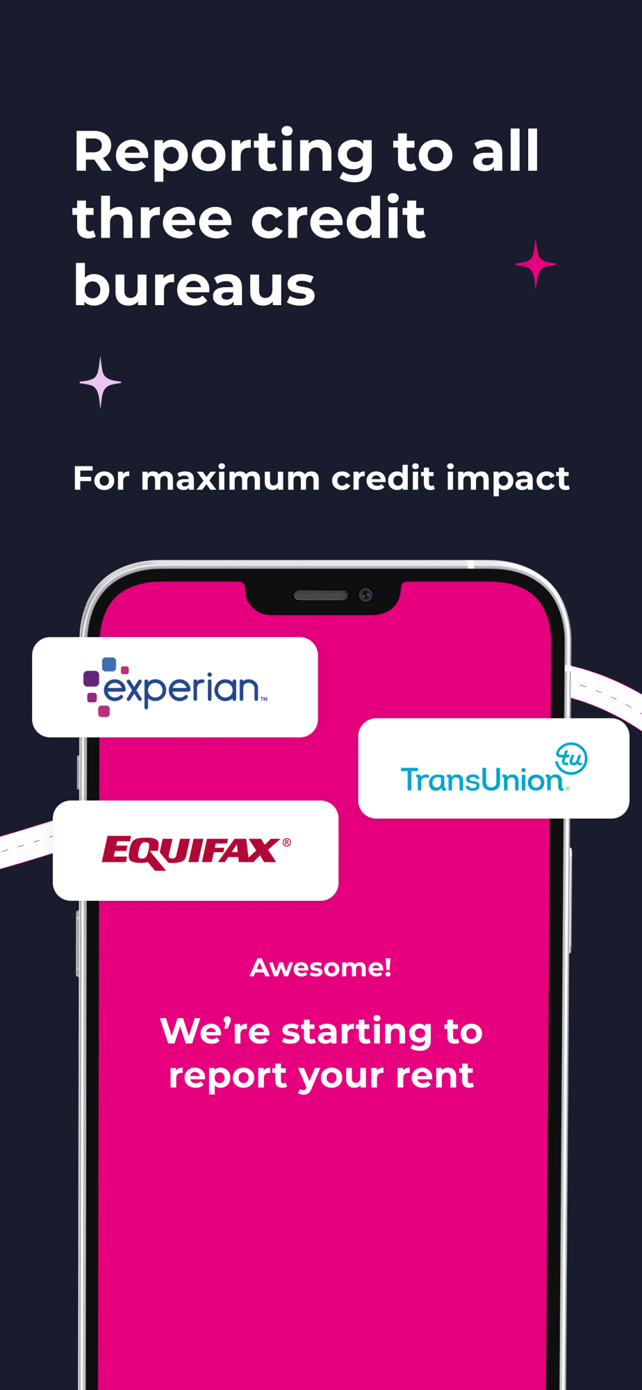 Use our BoomReport feature to report the rent payments you already make to the credit bureaus to build credit. With Boom, report your ongoing payments, past payments (up to 24 months of prior history), or both! Boom reports rent payments to all 3 major credit bureaus - Experian, TransUnion, and Equifax.