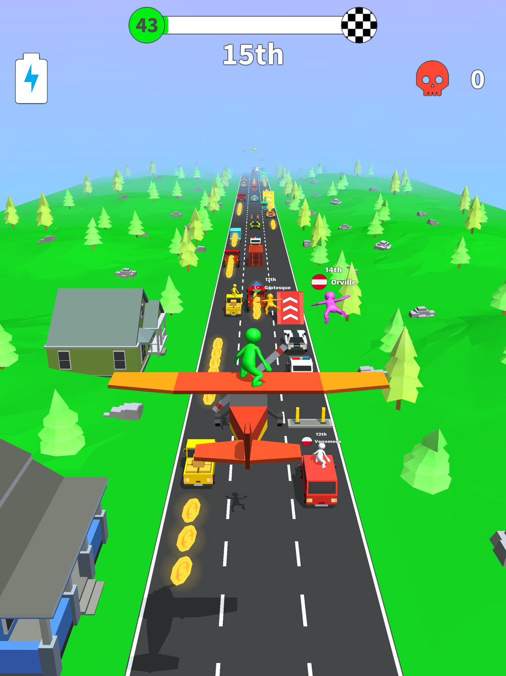Bump other players, Flip Car, Collect coins. Try to get on the plane. Avoid obstacles and traffic cars. Don't hit the road. Did you crash ? Fly and choose a fast car.