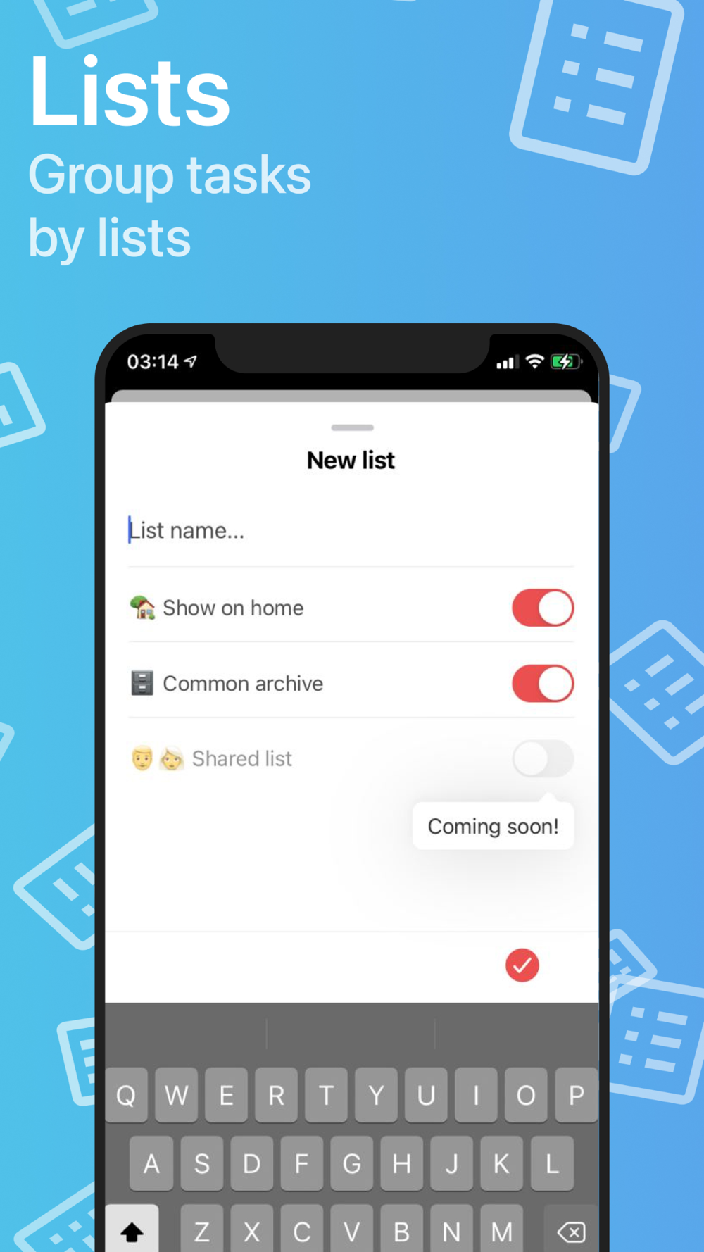 The app supports lists creation, we sort tasks by time to do.