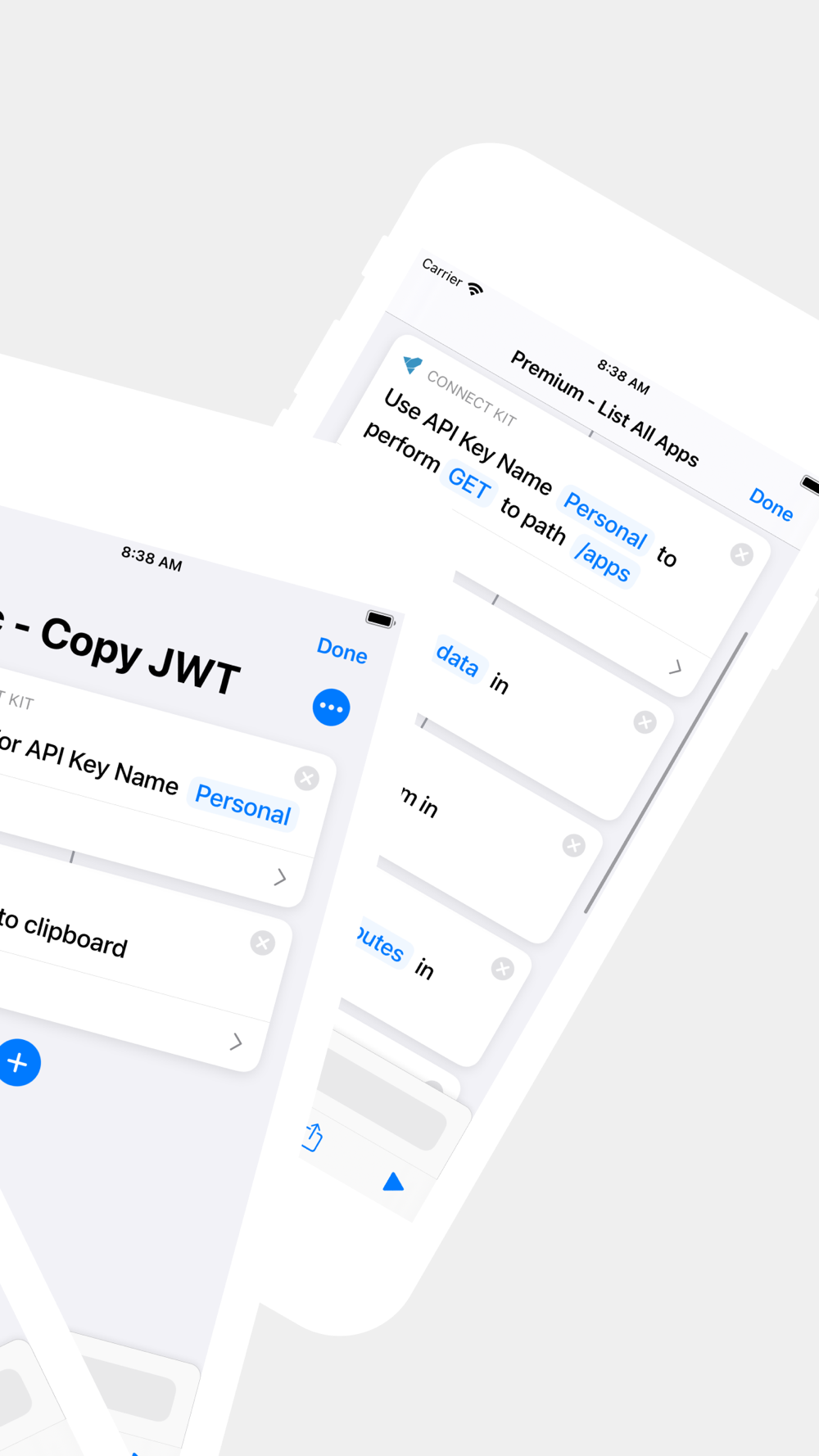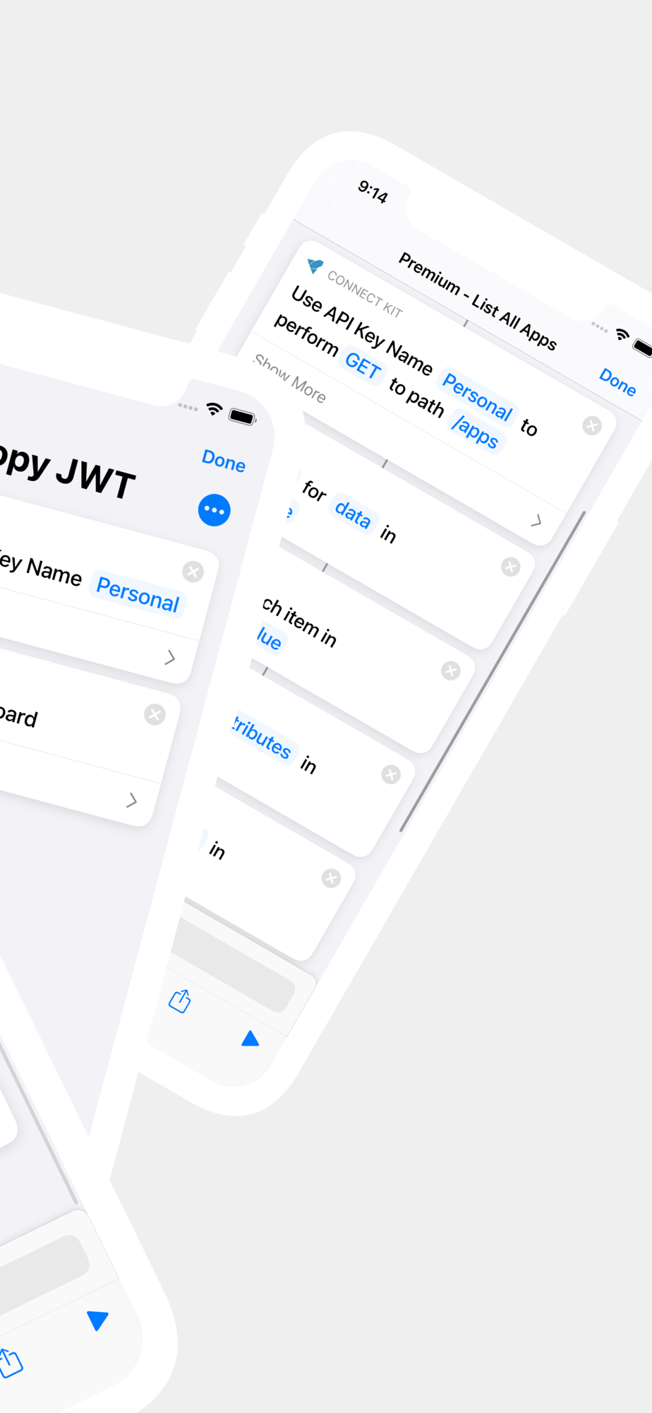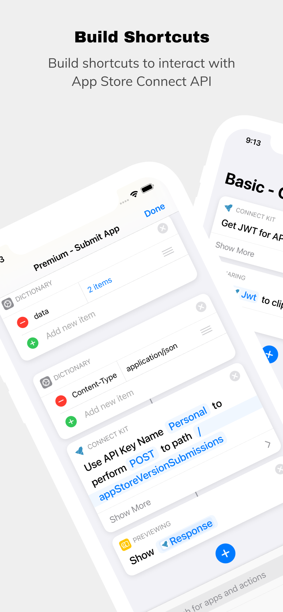 A Shortcut action to create a JSON Web Token (JWT) for authorization in HTTP requests is included for everyone! It can be used with the "Get Contents of URL" action to make requests to the App Store Connect API.