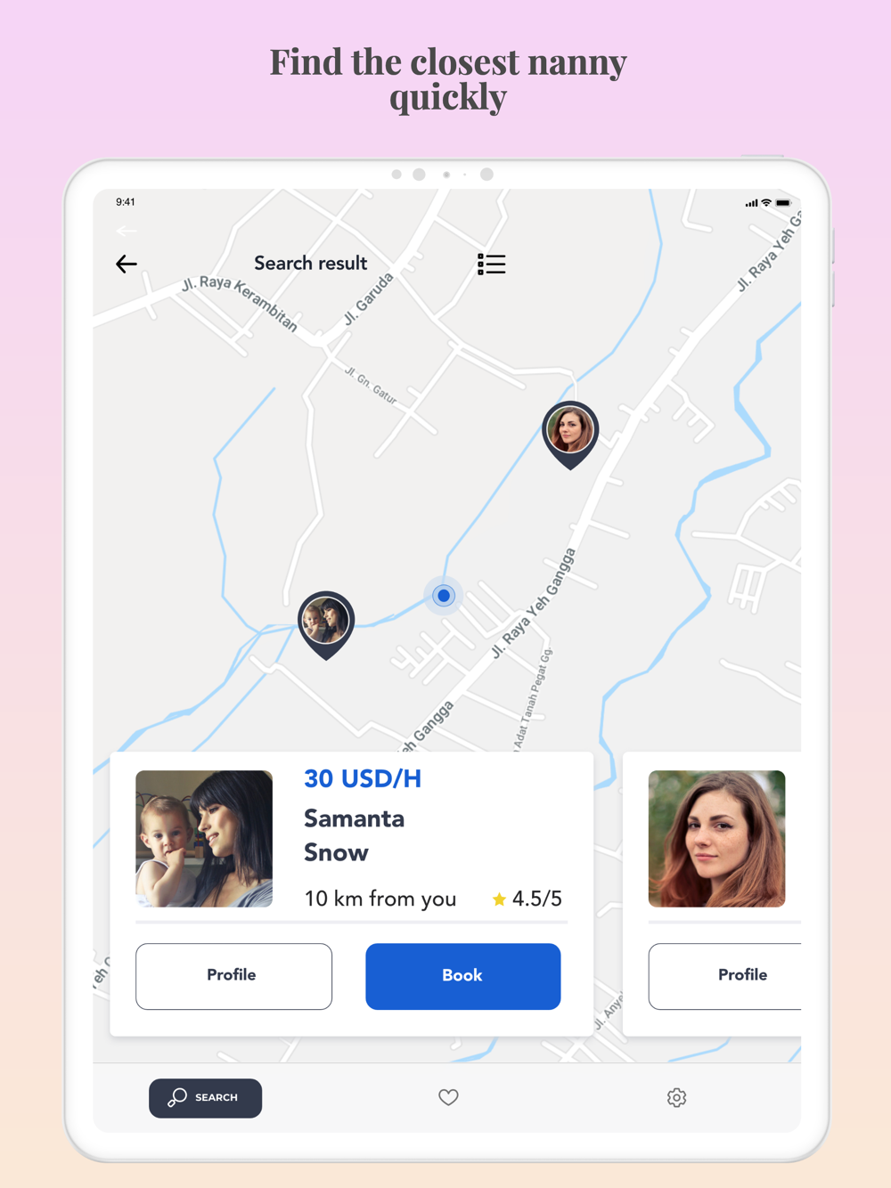 The map shows babysitters who are closest to you willing to cooperate, so you know where they are and know that they are available. Thanks to the easy sitter finder, you will quickly find the best one that suits your preferences.