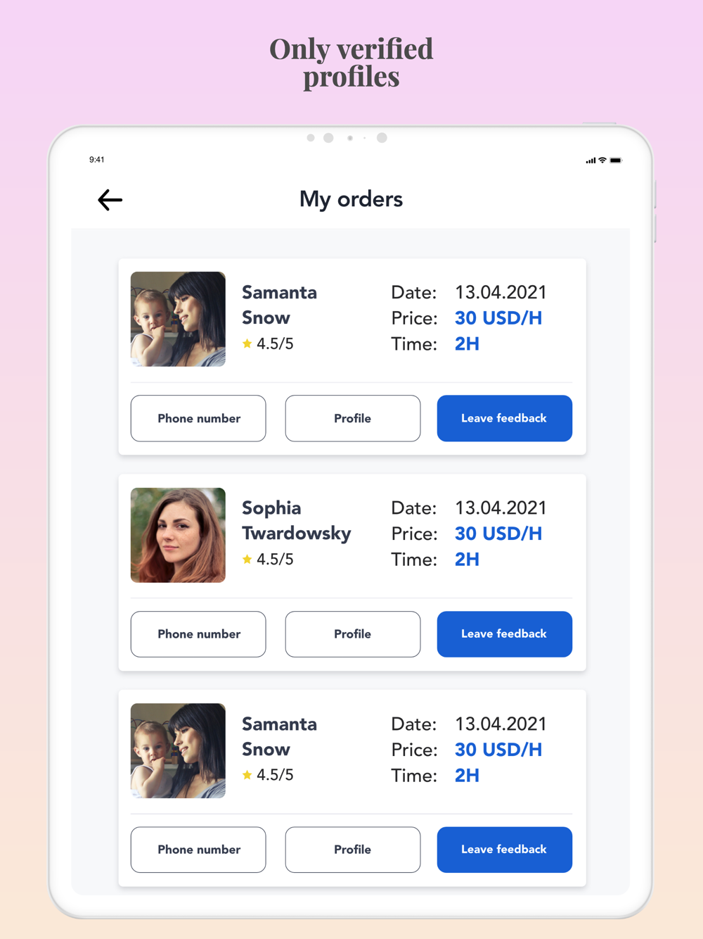 By creating a babysitter profile in the app, you can set your hourly rate and the minimum duration of care. You can also accept or decline orders for the care of the elderly. You decide when you work and when not - you can hide your profile at any time.