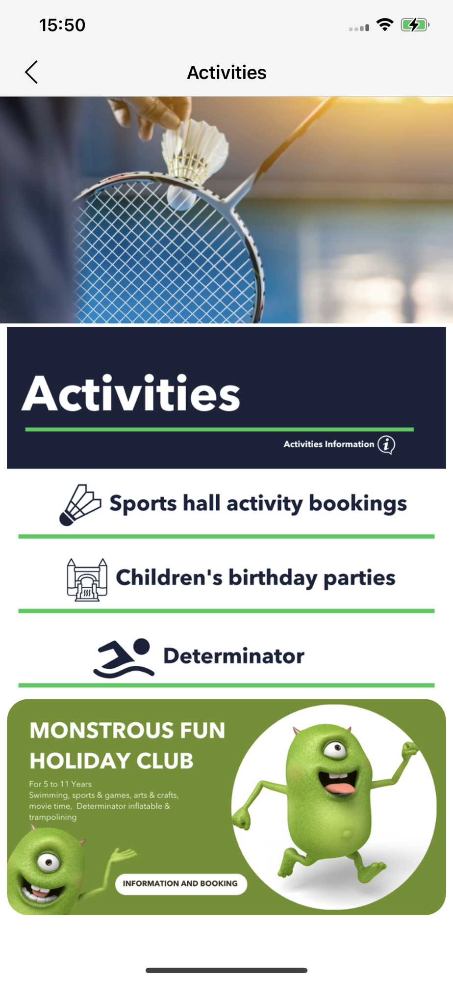 Direct access to all sports centre activities and classes – all on the move! Save your favourites to make rebooking easy and get push notifications to remind you!