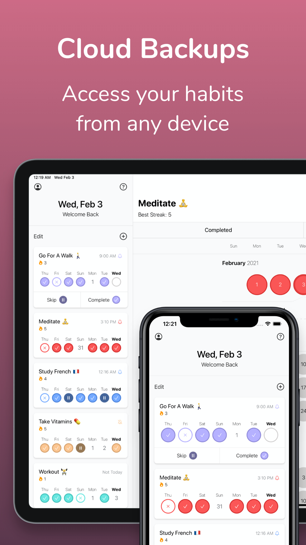 At HBT, accounts are optional, but just by creating an account, you get cloud backups for free. This allows you to use HBT from multiple devices and prevents you from losing your streaks when you move to a new device. You don’t need to have an account to start using HBT!