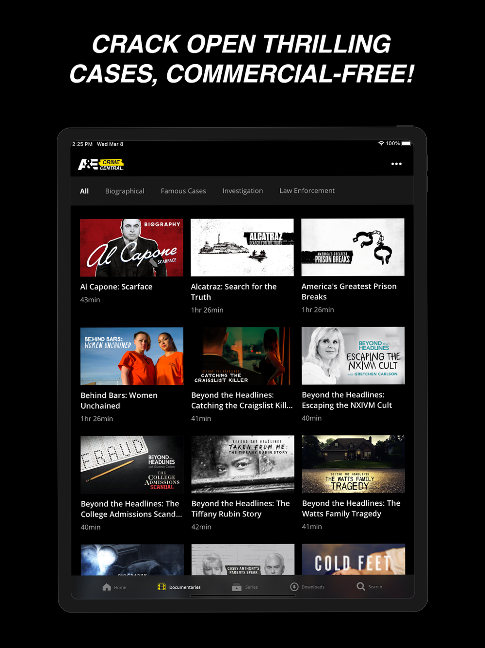 A&E Crime Central brings you the best of A&E’s true crime documentaries and series, commercial-free! Stream over 1,500 titles like 60 Days In, After the First 48, Girl in the Box, and more.