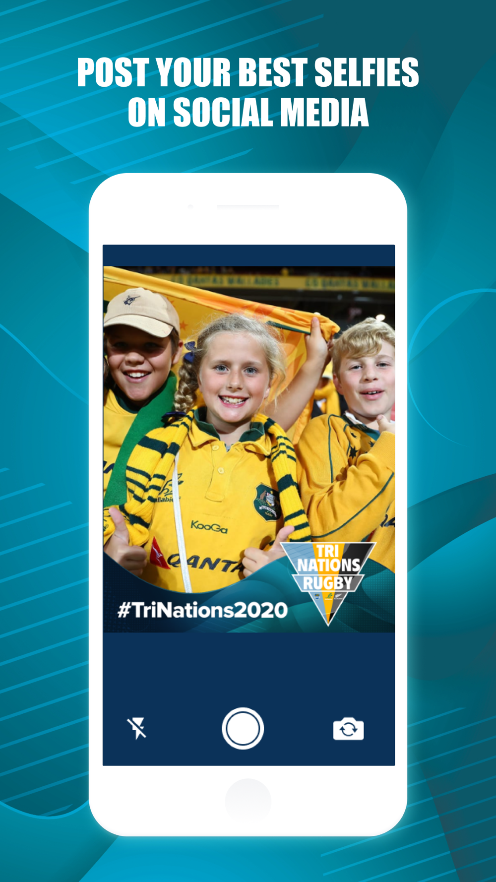 Take selfies and pictures during the game, add the Tri Nations 2020 social frame on top of it and share with your friends.
