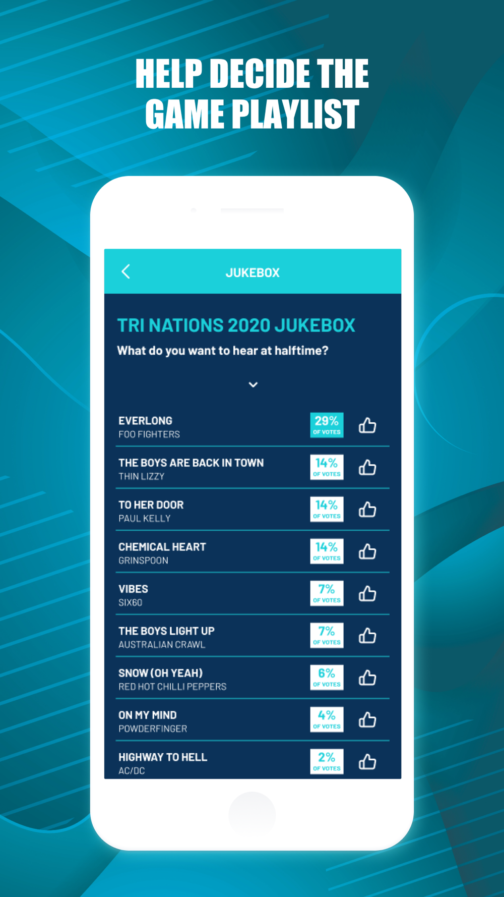 Have your say on Match Day! Be part of the live voting experience in the Tri Nations arena. Cast your vote and light up the stadium.