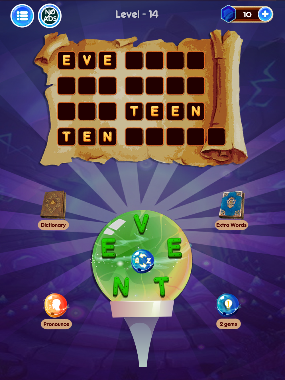>Pronunciation: Word Wizard includes voice over of every word, thus the only game where you can learn correct pronunciation of words.