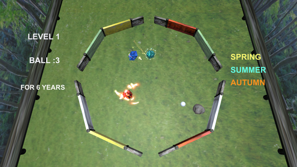 You have 5 balls in a game and get one trained year by hitting boards which have four types associated with the seasons.