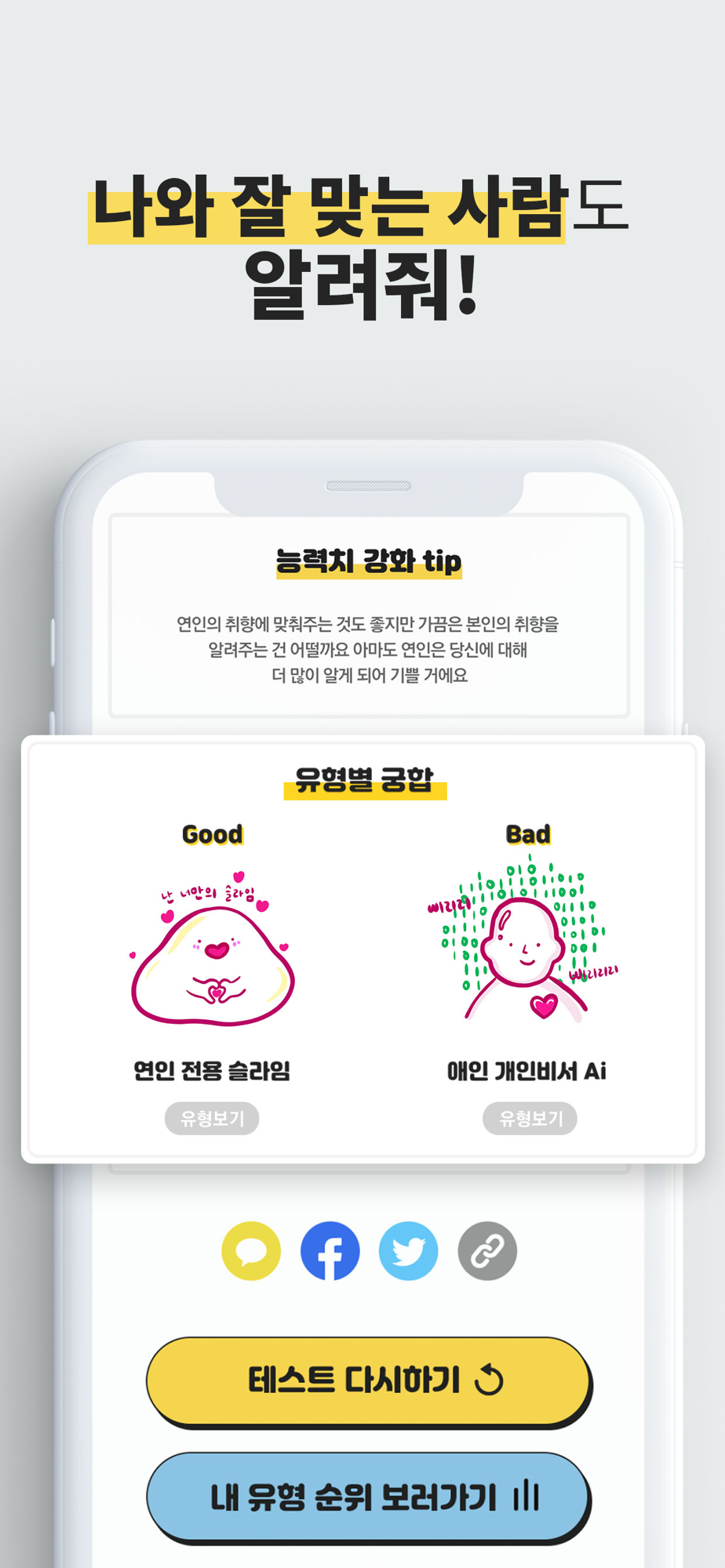 나와 비슷한 사람은 얼마나 있는지, 나랑 잘 맞는 사람은 어떤 사람일지… ‘ 나’ 에 대한 모든 것을 알아볼 수 있어요.