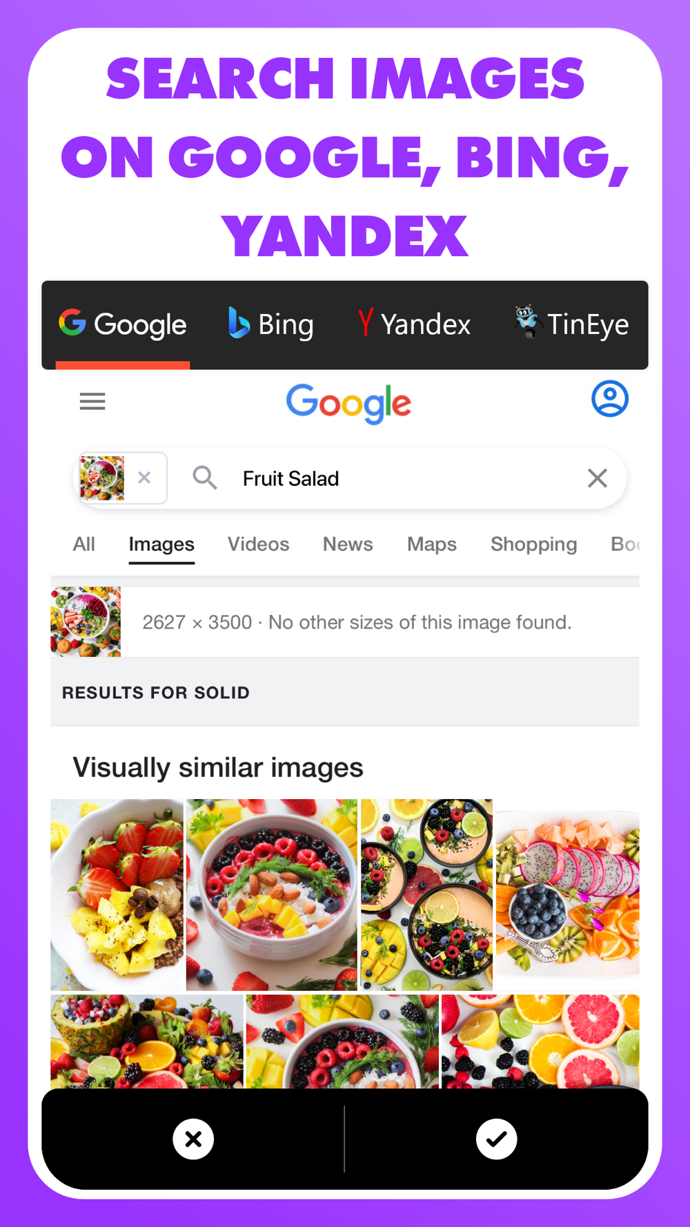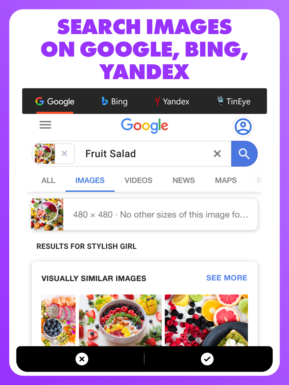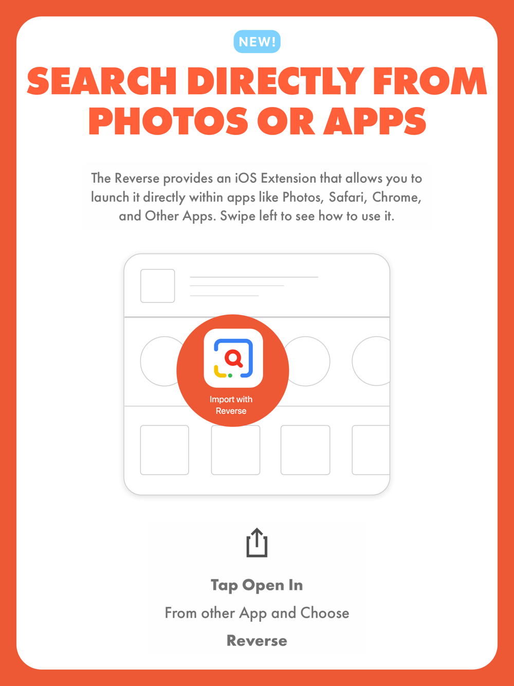 • Search image directly from within the Photos app, or any other apps through Share