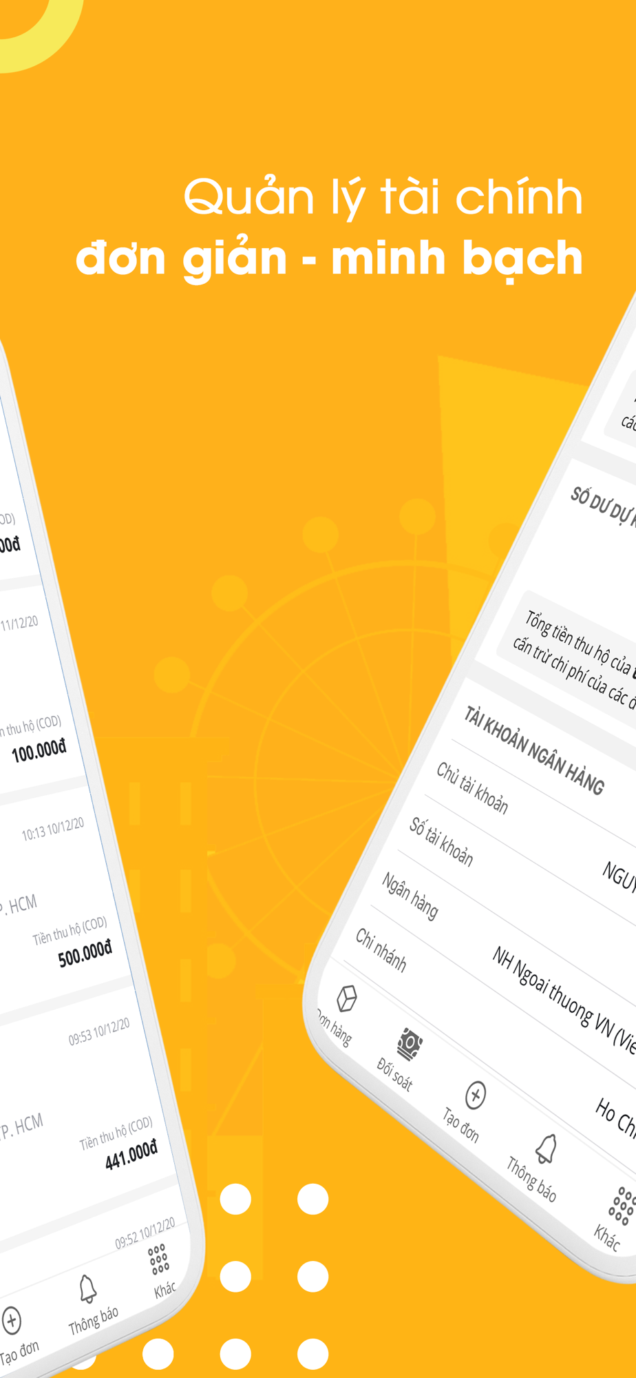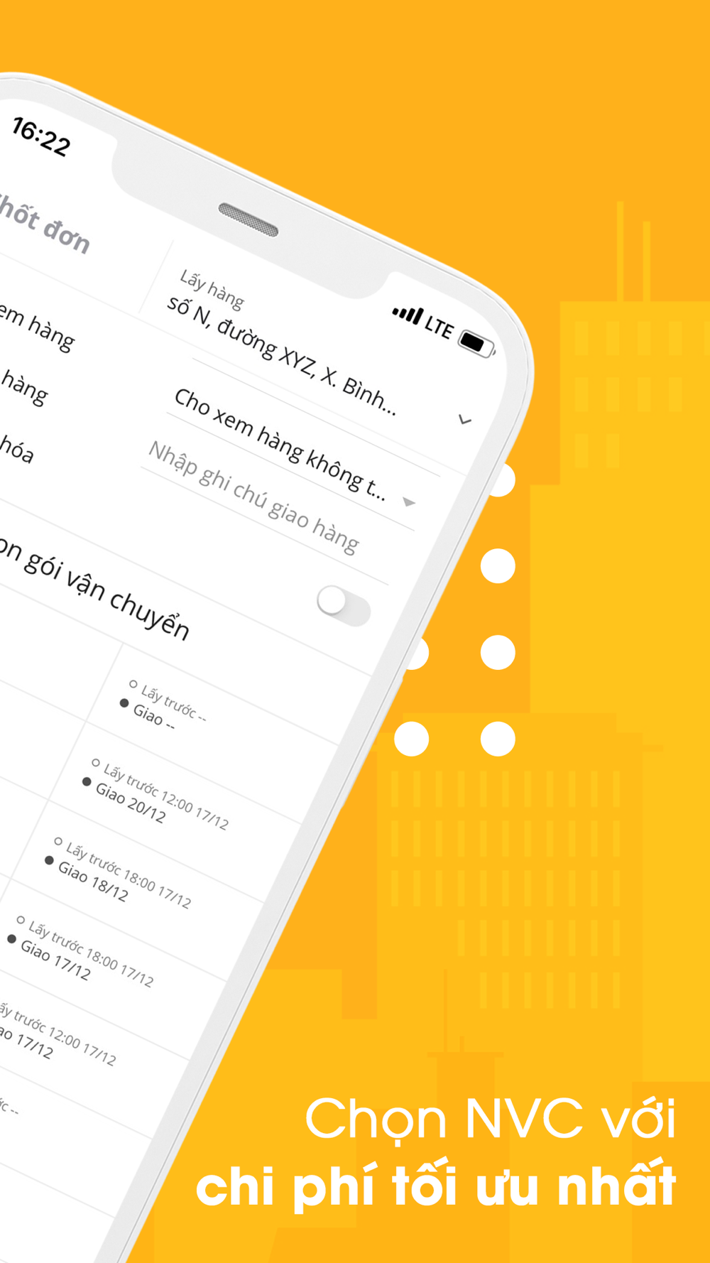 Đơn hàng được lấy và giao bởi các Hãng Vận Chuyển lớn nhất có năng lực vận hành tốt nhất Việt Nam: Giao Hàng Nhanh (GHN) - Giao Hàng Tiết Kiệm (GHTK) - Viettel Post (VTP). Tối ưu rủi ro và chi phí, bằng cách giúp bạn so sánh giá vận chuyển trực quan nhất.