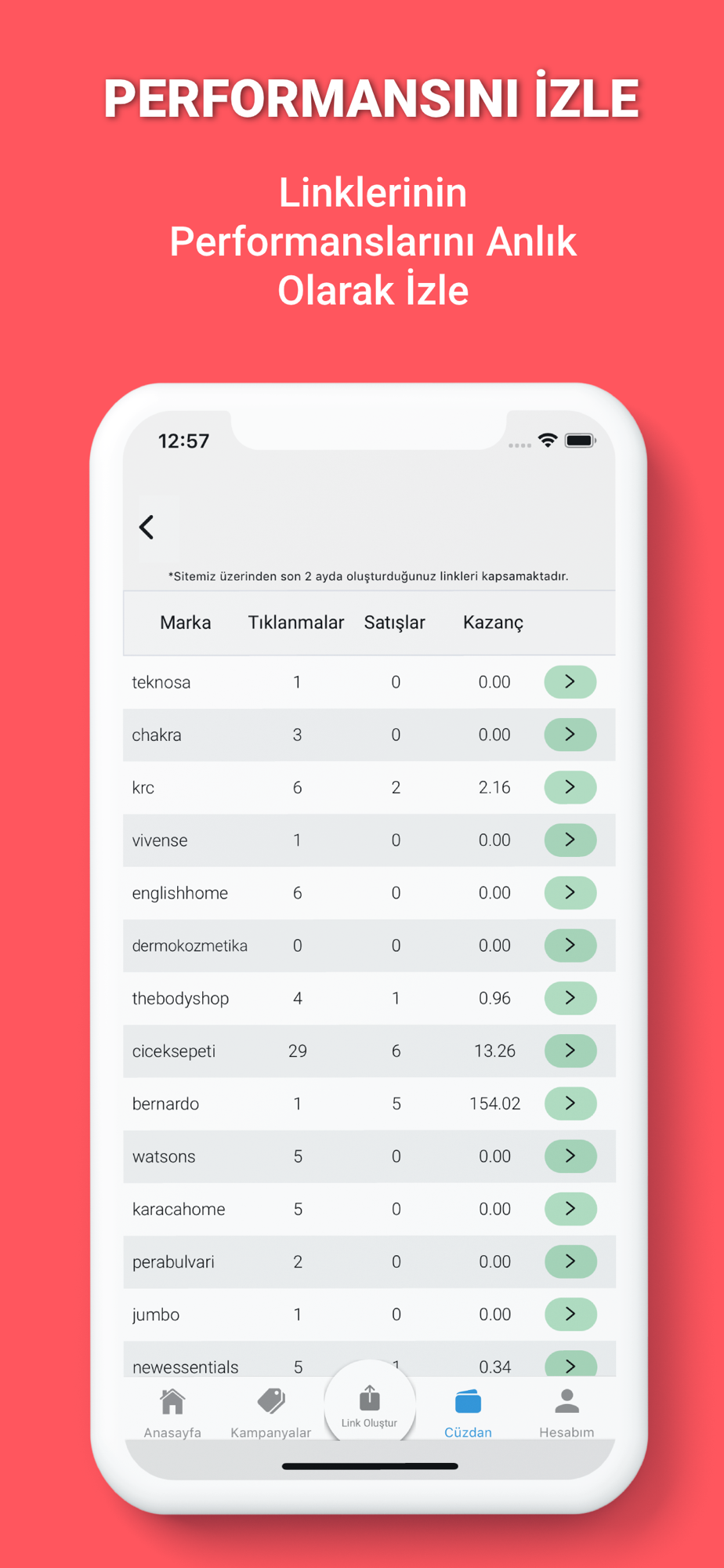 Cüzdan ve Performans Bilgilerim alanlarından linklerinden gelen tıklama, alışveriş sayısı ve kazançlarını anlık olarak takip edebilirsin.