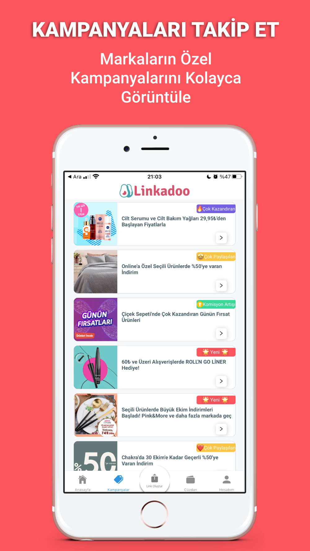 Linkadoo mobil uygulamasını indir, Karaca, Watsons, Çiçek Sepeti, Teknosa, English Home, Emsan, Jumbo, Bernardo, Chakra, Bella Maison, The Body Shop, Vivense ve Flormar ve birçok farklı sevilen markadan istediğin ürün ve kampanyayı seç.