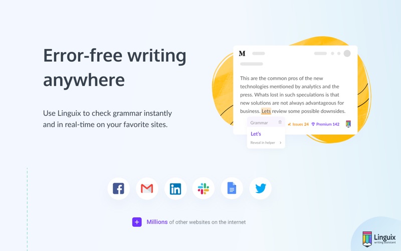 Linguix makes your sentences as clean as a whistle. It instantly checks the spelling and grammar of your text, almost anywhere on the web you type it, including on social networks like Facebook, Twitter and LinkedIn, email services like Gmail, or blogging platforms like Medium and Wordpress.