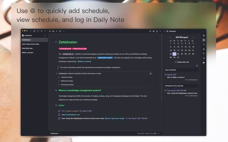 - Schedule, use @ to quickly add a schedule, and you can view the schedule, and take notes in Daily Note.