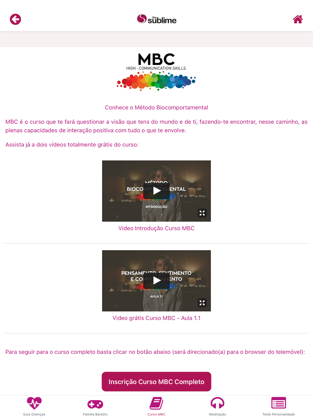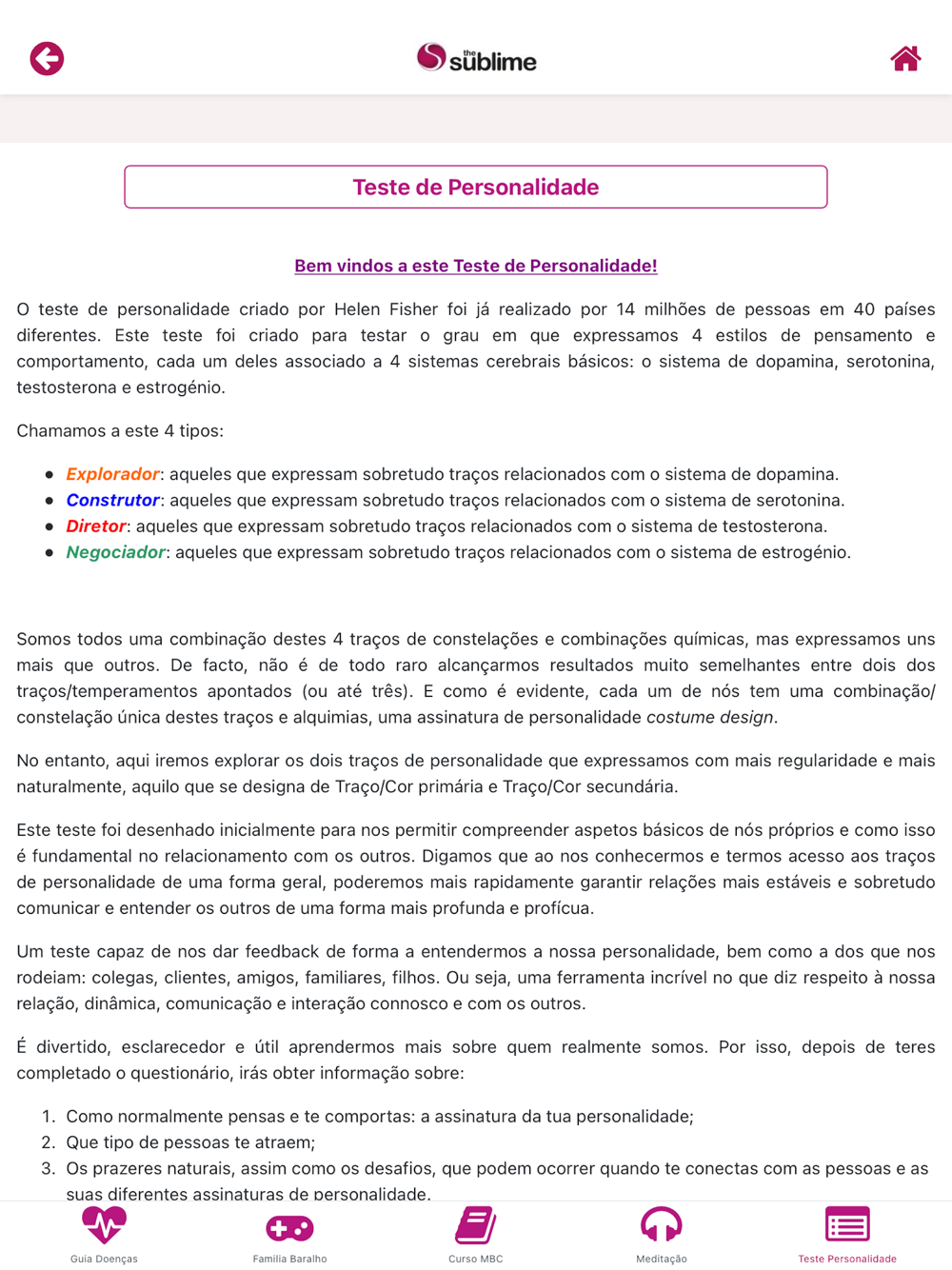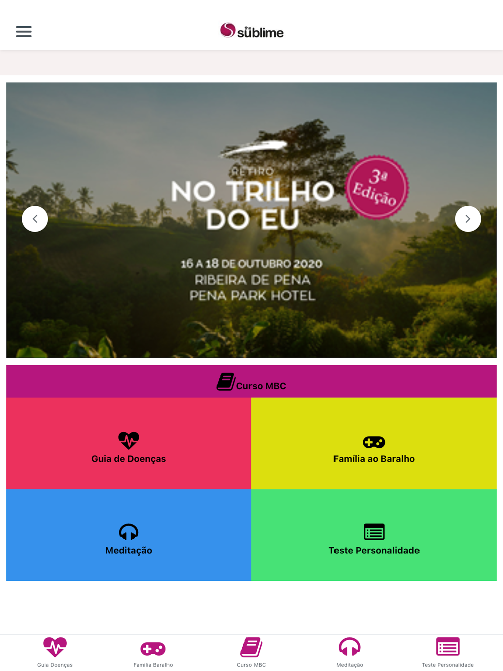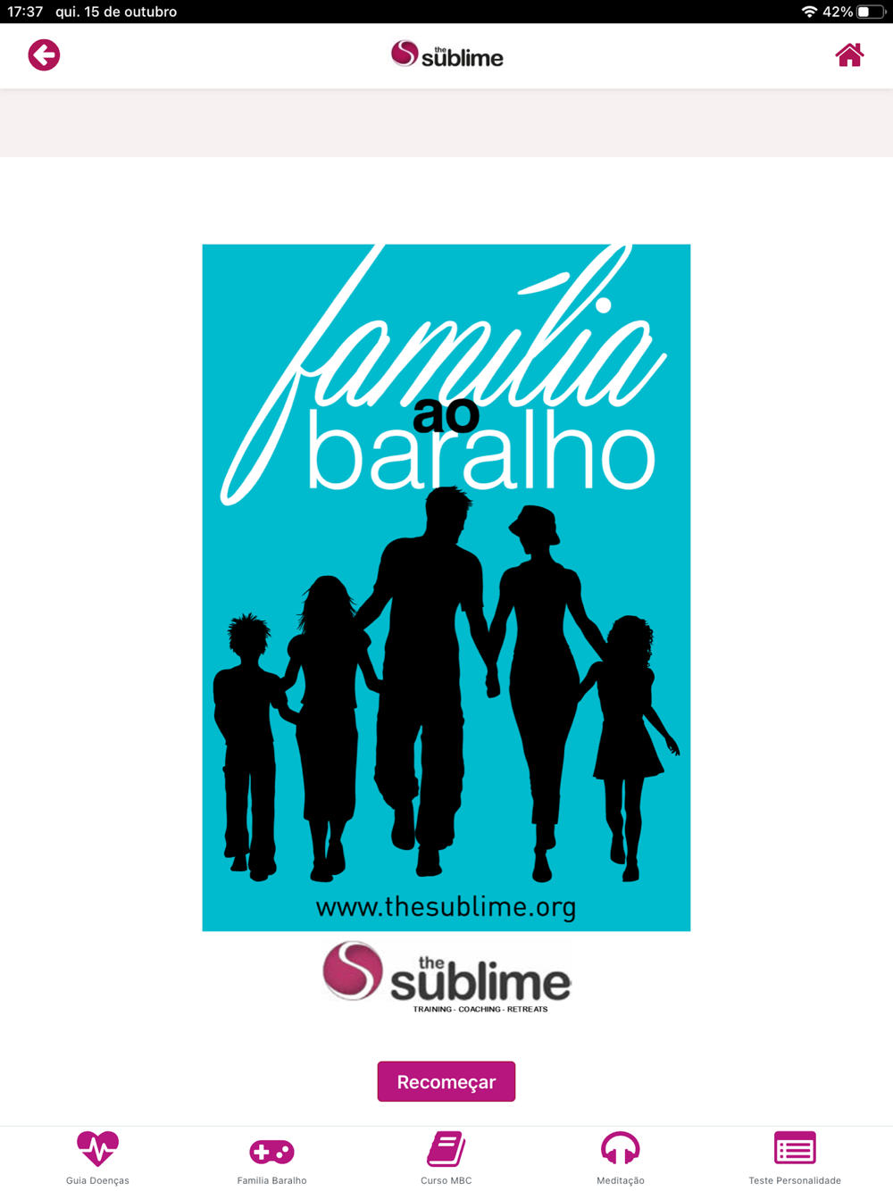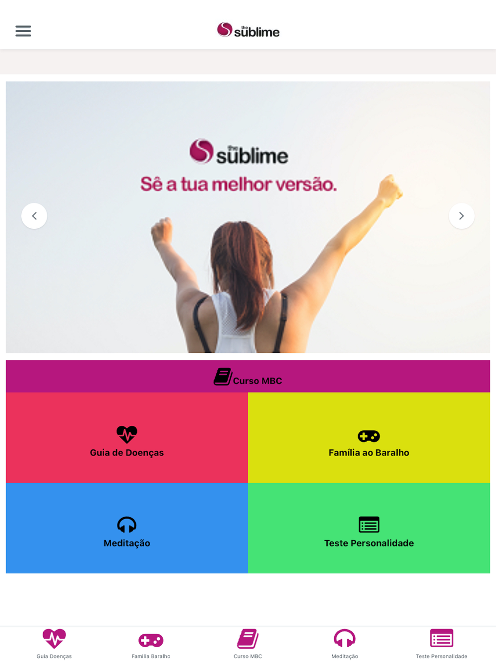 The Sublime é uma APP do projeto Sublime www.thesublime.org que visa oferecer um conjunto de ferramentas de apoio ao desenvolvimento pessoal, auto conhecimento e divertimento em família. Além de permitir uma maior conexão pessoal, através de meditações, possui um teste de personalidade onde podemos aferir qual o nosso tipo de personalidade com resultado imediato. Podem, de seguida, ingressar num curso online onde irão aprender muito mais sobre vocês próprios e os que vos rodeiam. Complementem isso com o jogo Família ao Baralho onde vão aprofundar o conhecimento que têm sobre a vossa família a jogar de uma forma divertida.