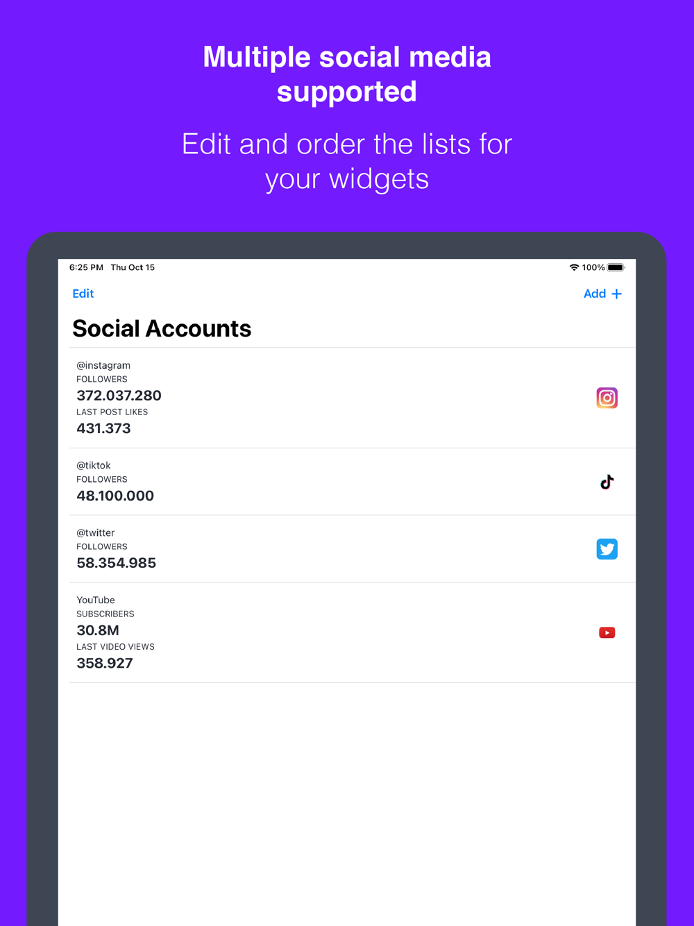 Social Count lets you track multiple social media (TikTok, Youtube & Twitter) accounts and display your followers count in a widget.