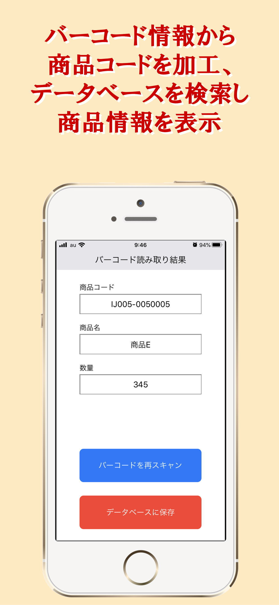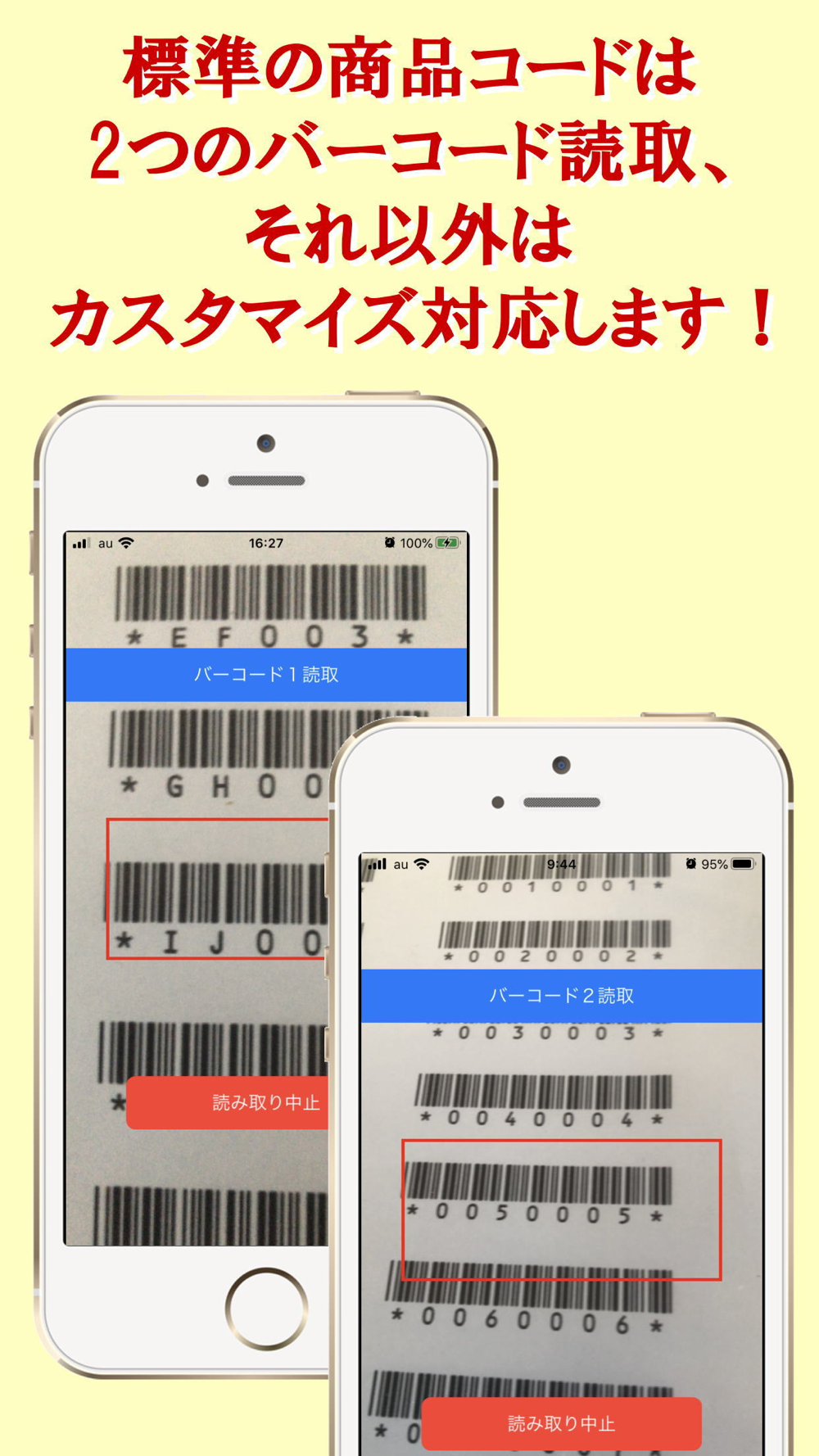 商品コードは2つのバーコードを組み合わせたものを標準としています。これとは異なる商品コードを扱っている場合、それに合わせてアプリをカスタマイズ対応いたします。