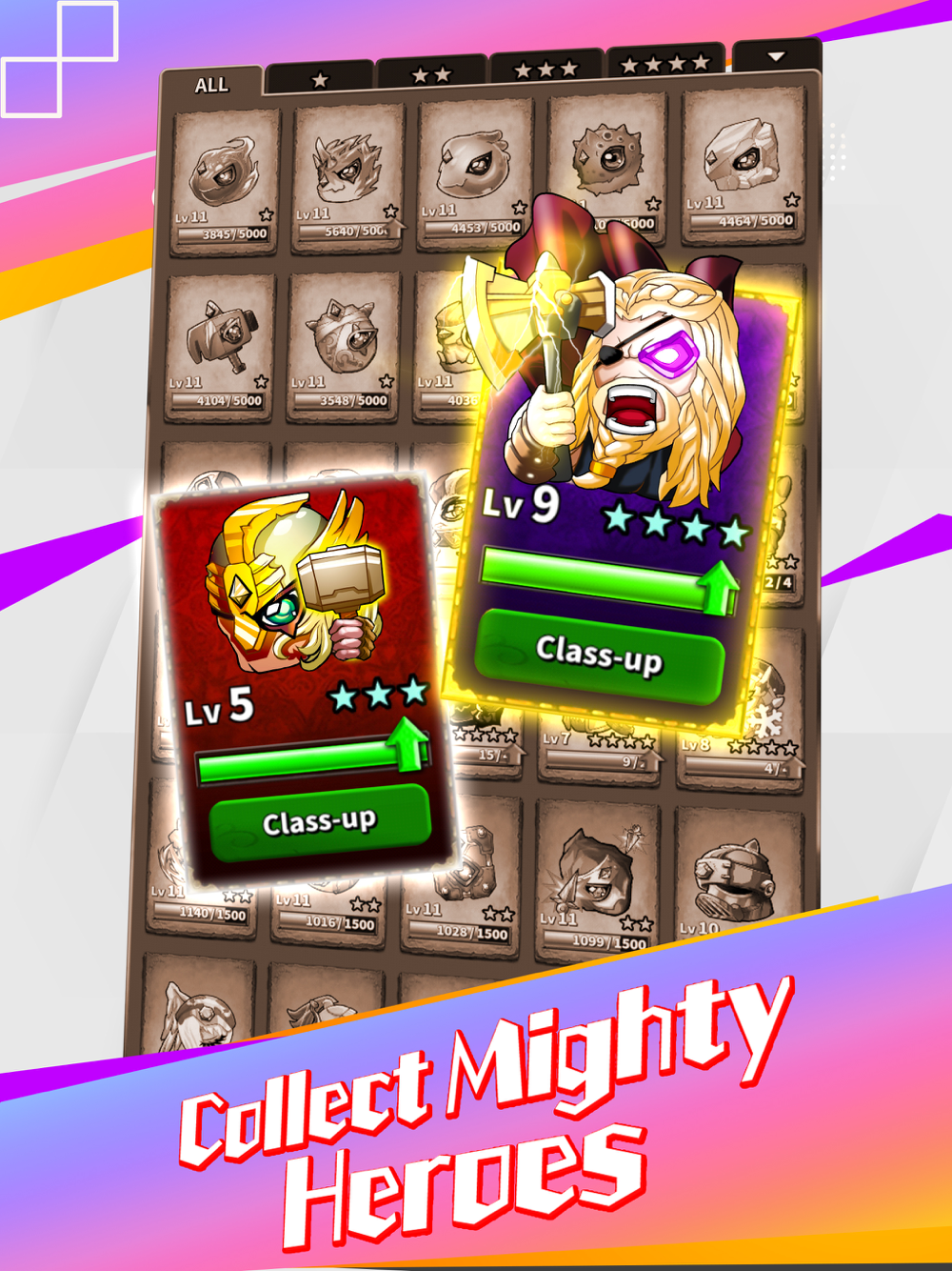 Collect favorite hero and class-up dozens of Magic Stone Hero featuring 4 main types including Force, Magic, Combine, and Assist.