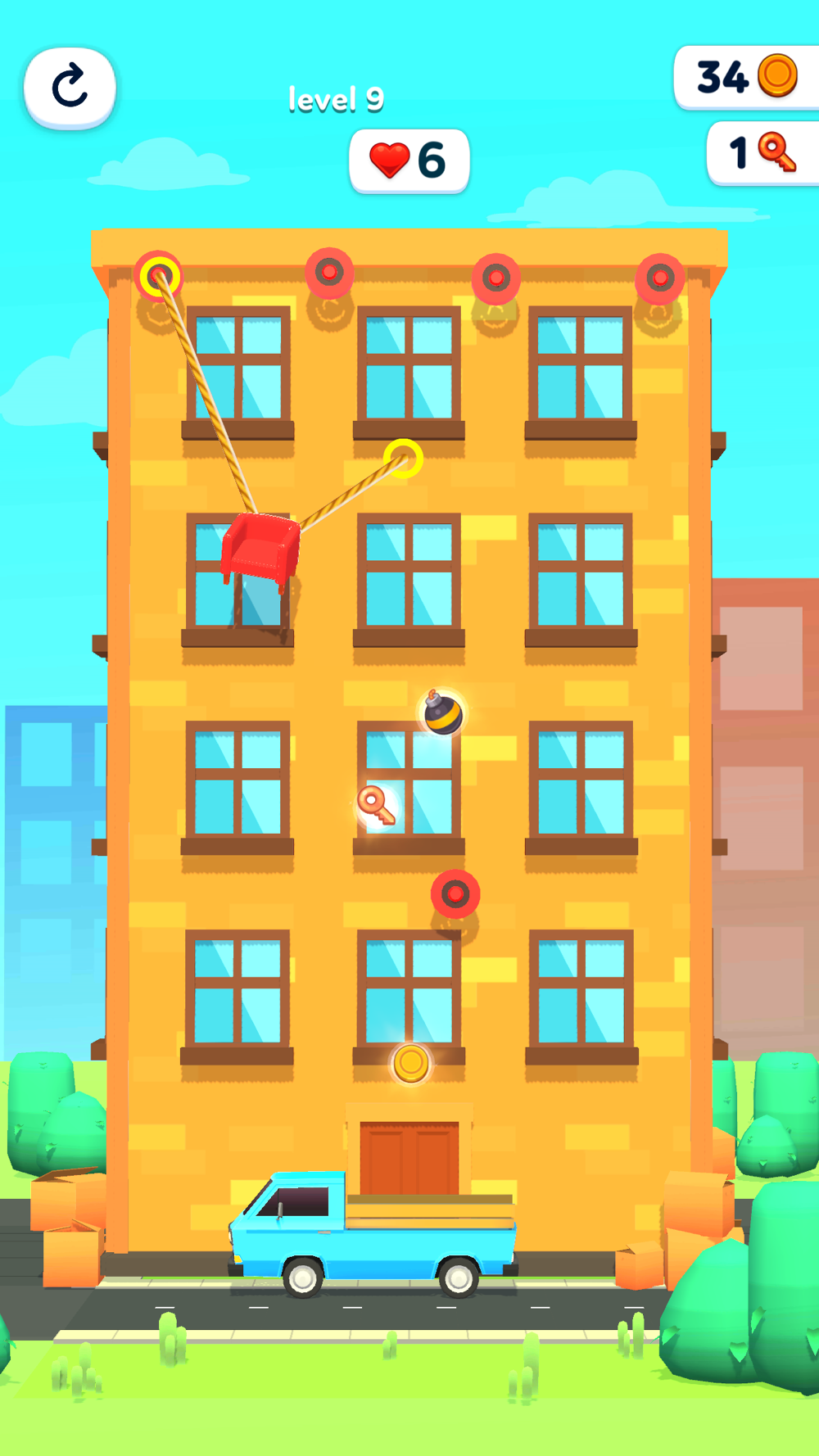 You will play the role of a loader who, using rubber bands, skillfully lowers household items to the first floor.