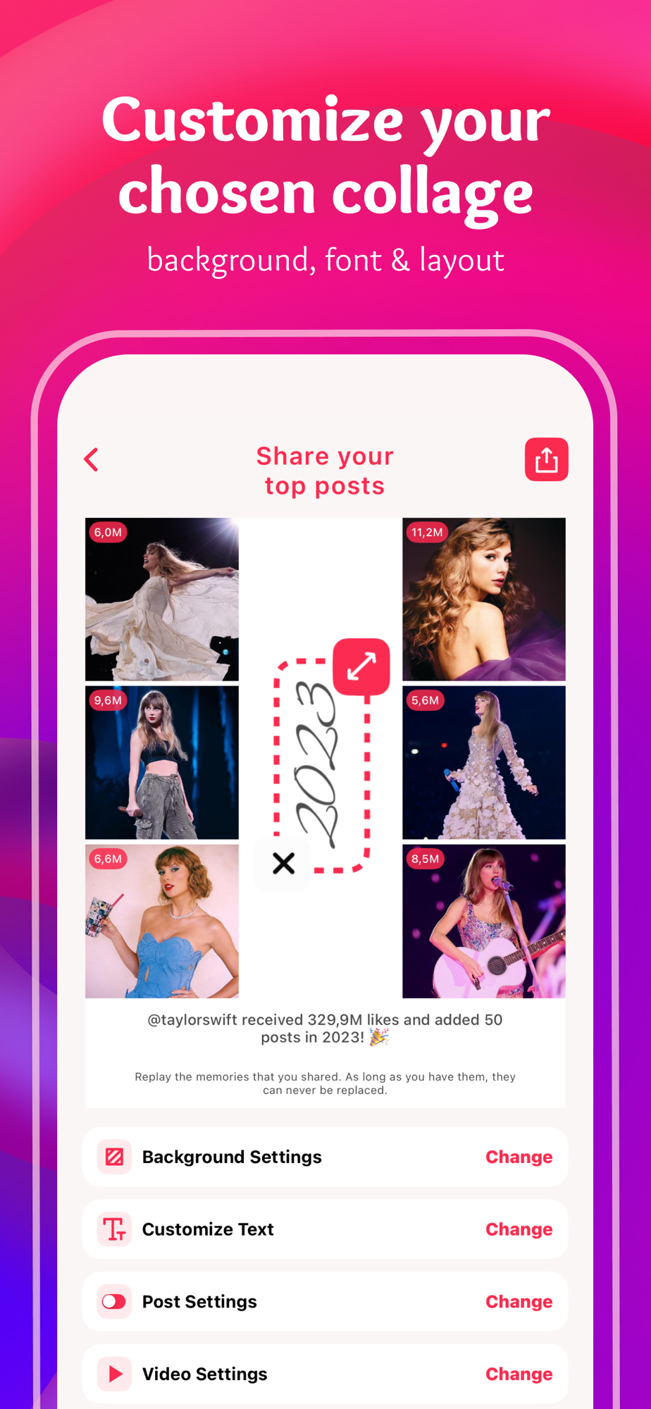 - With a year picker, you can generate collages of the TOP 9 Instagram moments from previous years, not just 2023.
