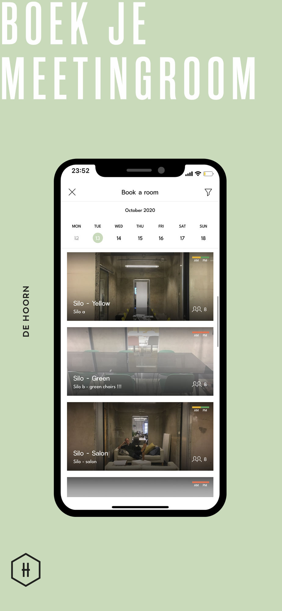 De Hoorn is graag de landingsbasis voor creatieve beroepen en digi-wizards met ambitieuze plannen. Tijd om je meeting te boeken, de deur te openen van je kantoor of incidentje te melden?